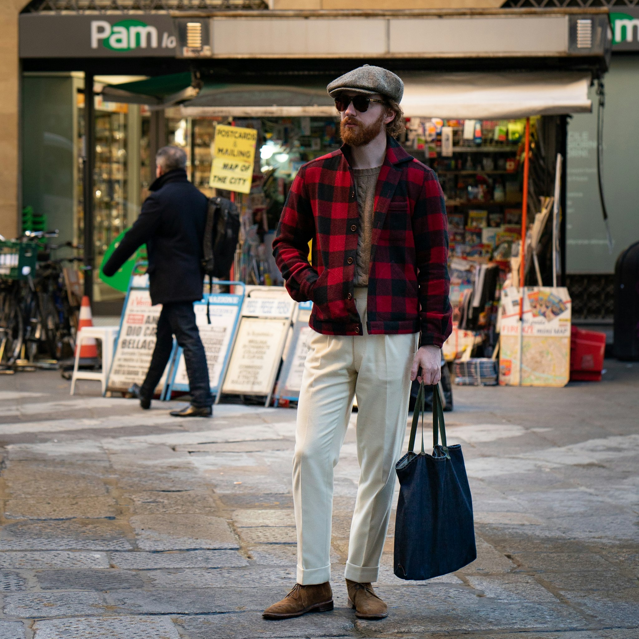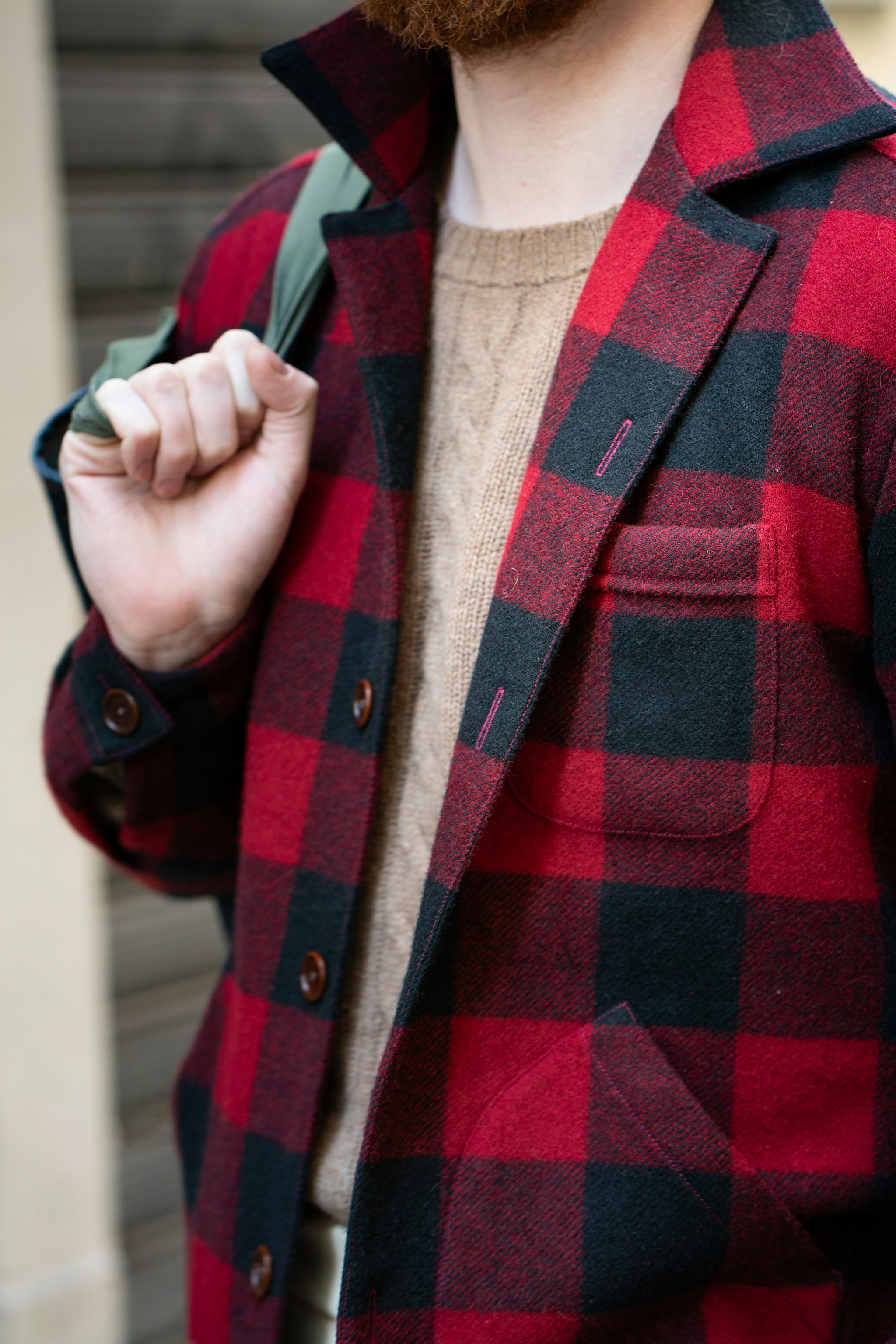Jim in our Buffalo Check 3PB with Camelhair Cable-knit sweater and bespoke trousers by Pommella Napoli in cream Fox Flannel.