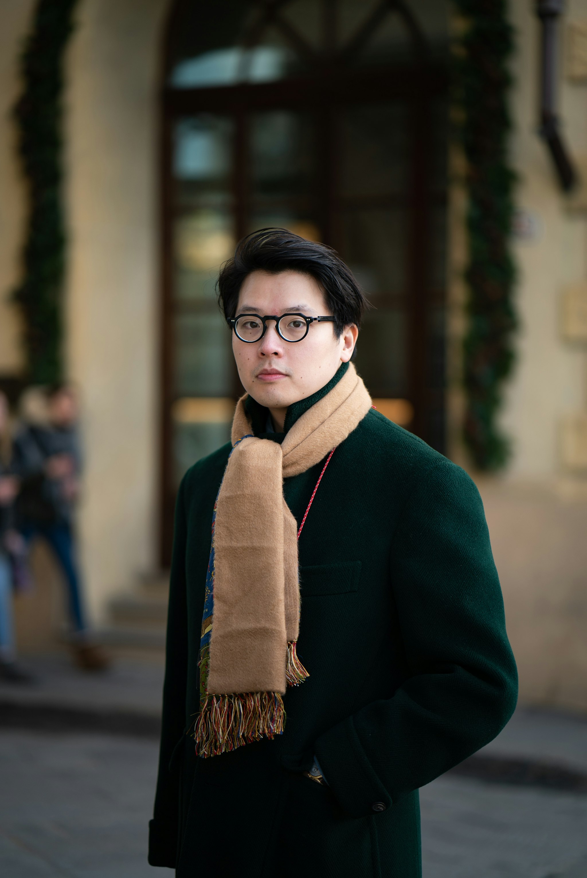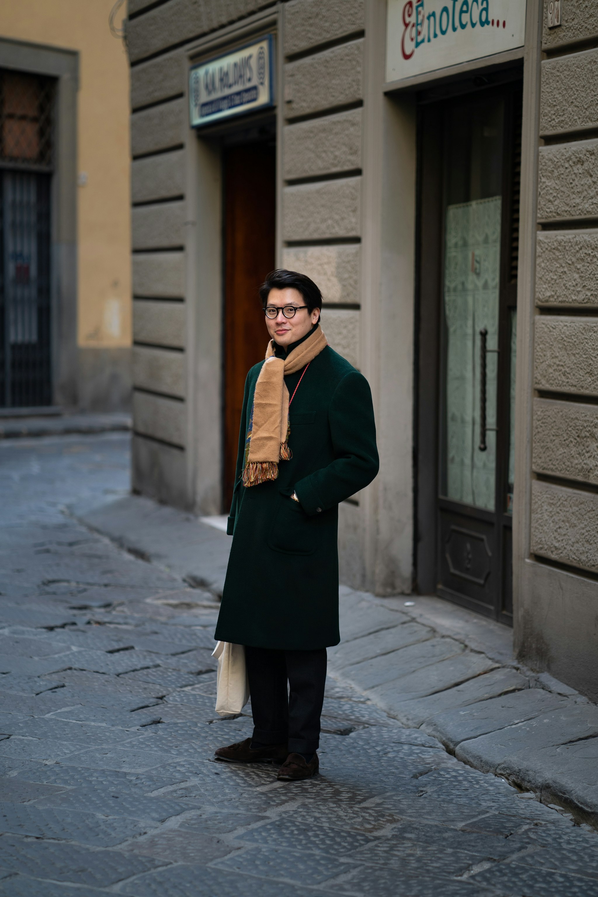 Mark is wearing a bespoke overcoat by Liverano & Liverano in a heavy green wool with a cashmere and silk faced Drake’s scarf.