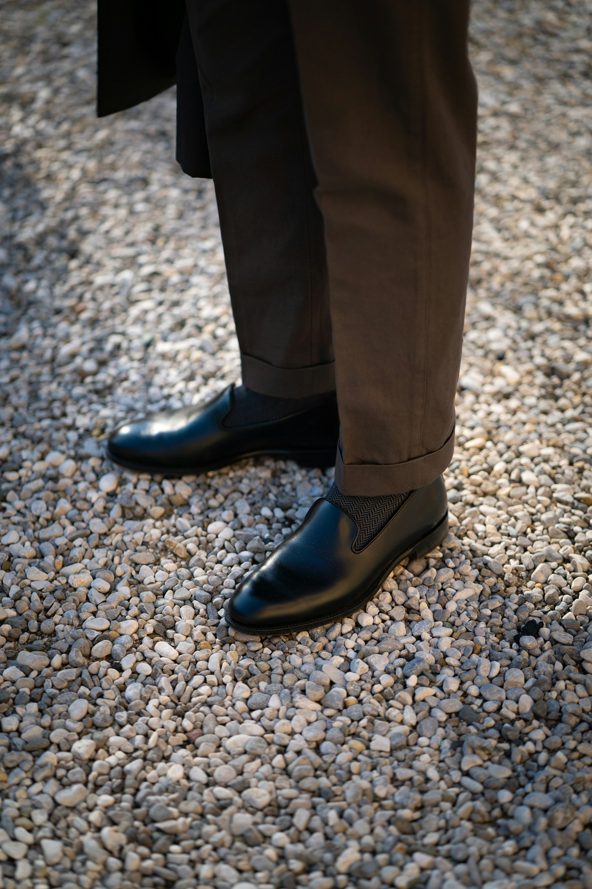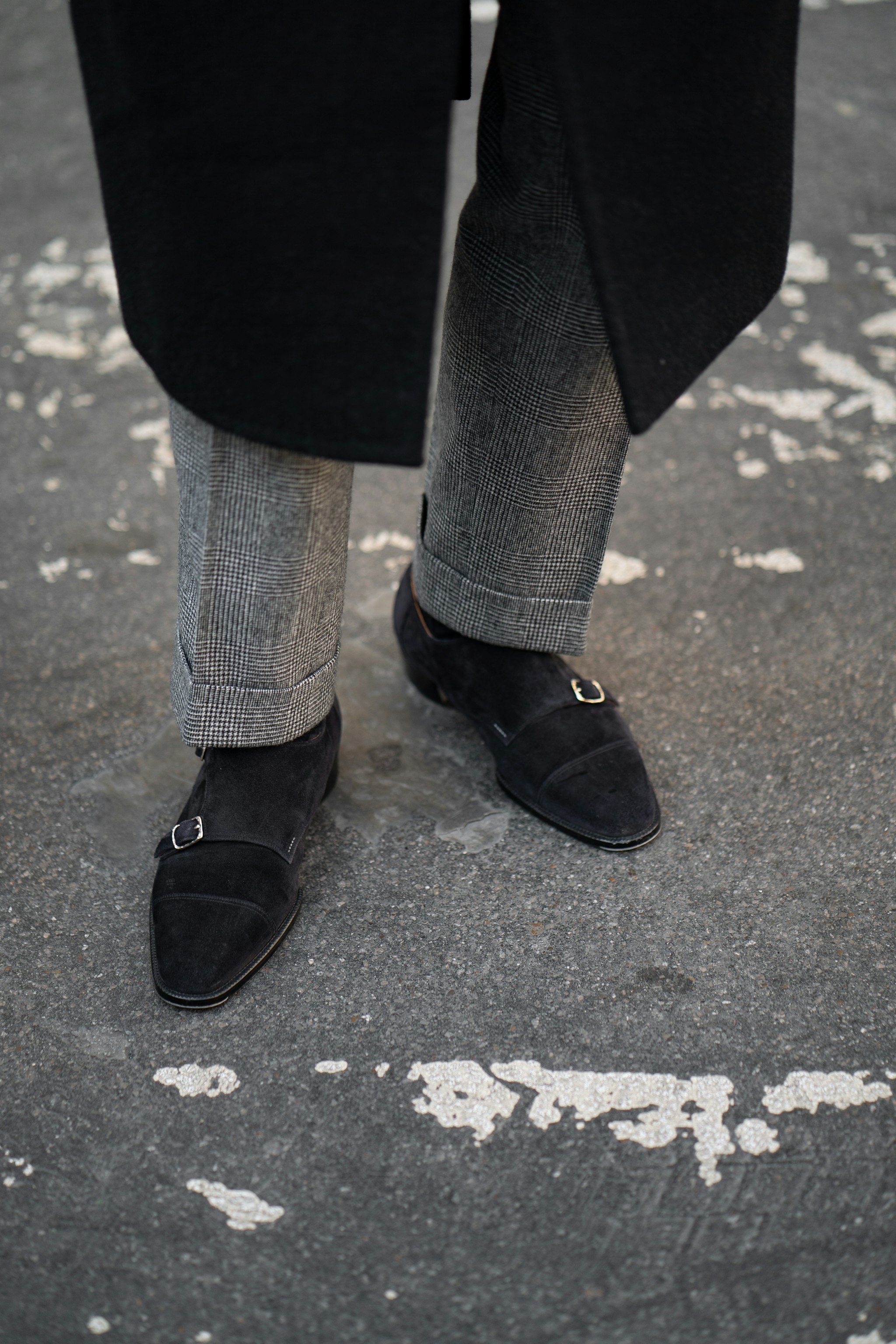 Alan is in his bespoke overcoat and double-breasted suit, both by Liverano & Liverano. The suit is made up in a Fox flannel glencheck and the overcoat is a dense and heavy wool by Wooden. Alan's shoes are bespoke by Koji Suzuki, made in black suede.