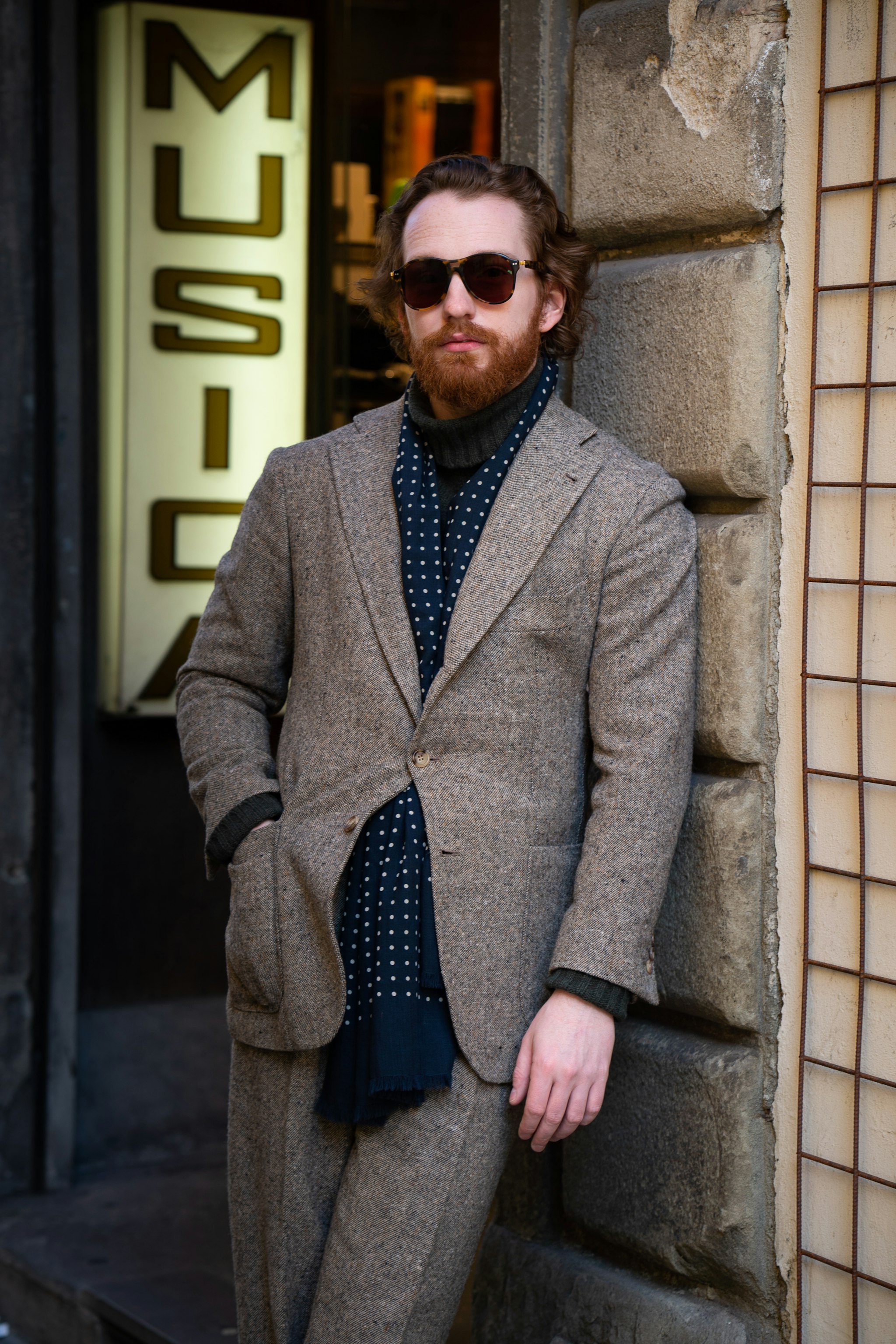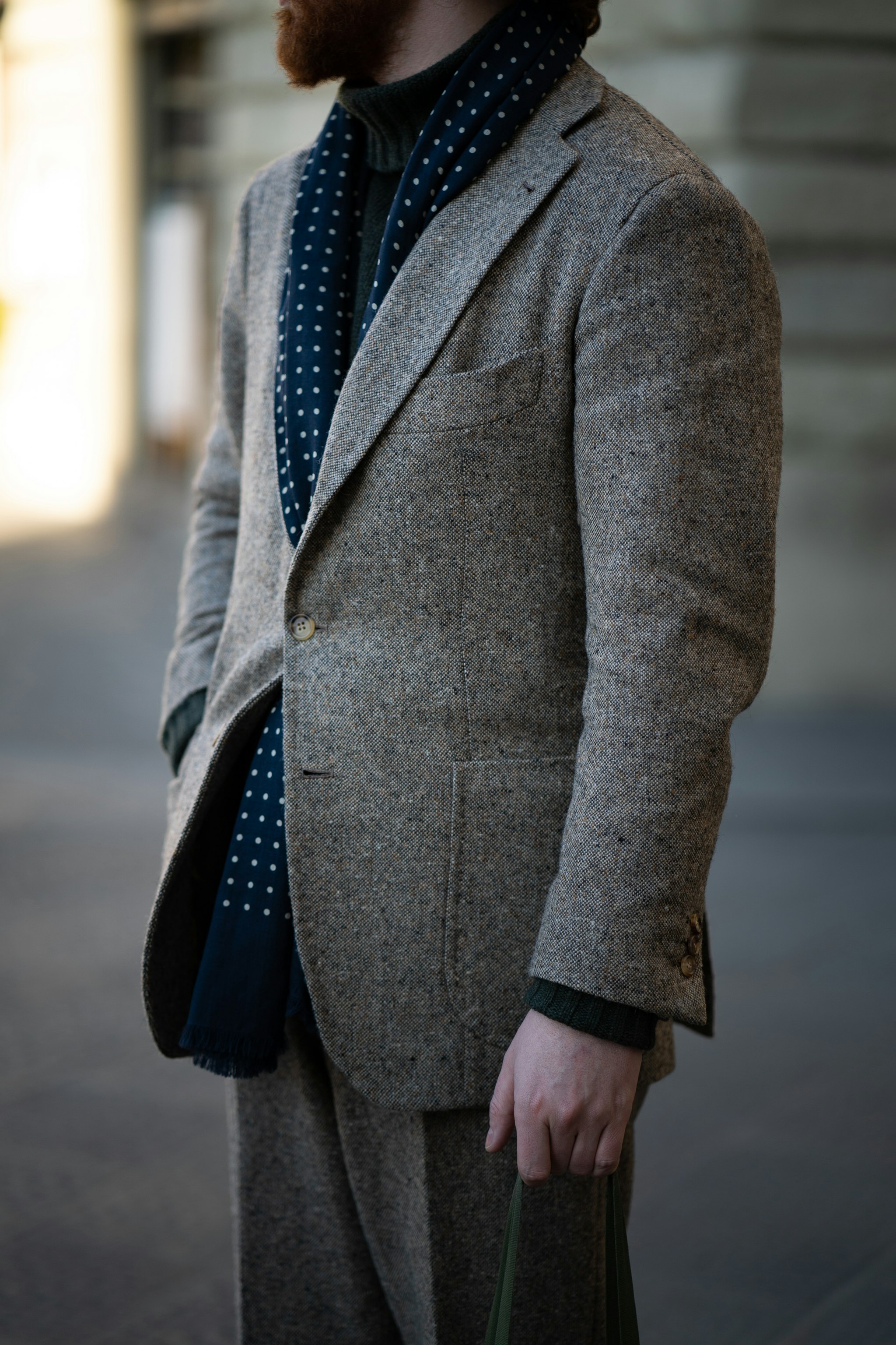 With cloth milled by Magee of Donegal, Ireland, Jim's jacket is Made-to-Measure by Orazio Luciano with matching trousers from Pommella Napoli worn over our lambswool rollneck with a Drake's scarf.