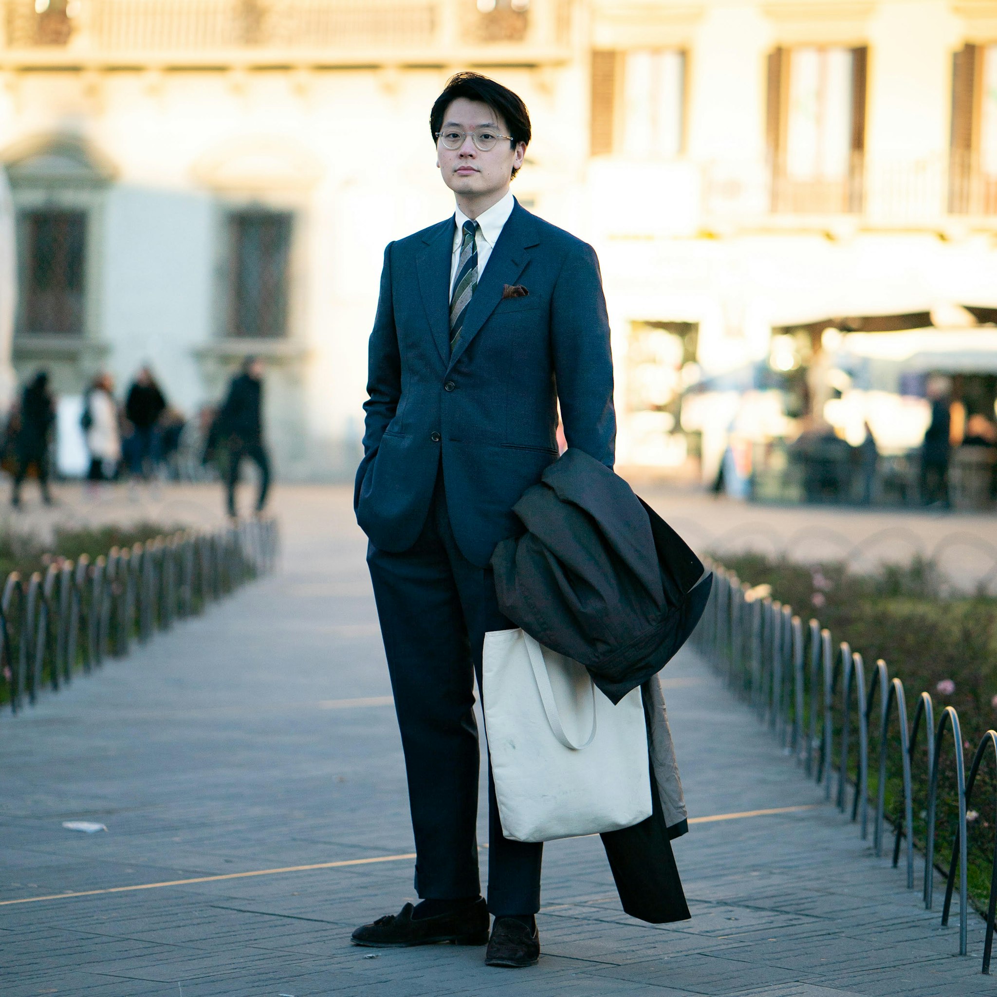 Mark is wearing a Made-to-Measure Armoury Model 101 in nailhead cloth by Vitale Barberis Canonico and the Coherence Marc coat. He's paired them with the new Hudson tassel loafer and Armoury tote bag; arriving Spring/Summer 2020.