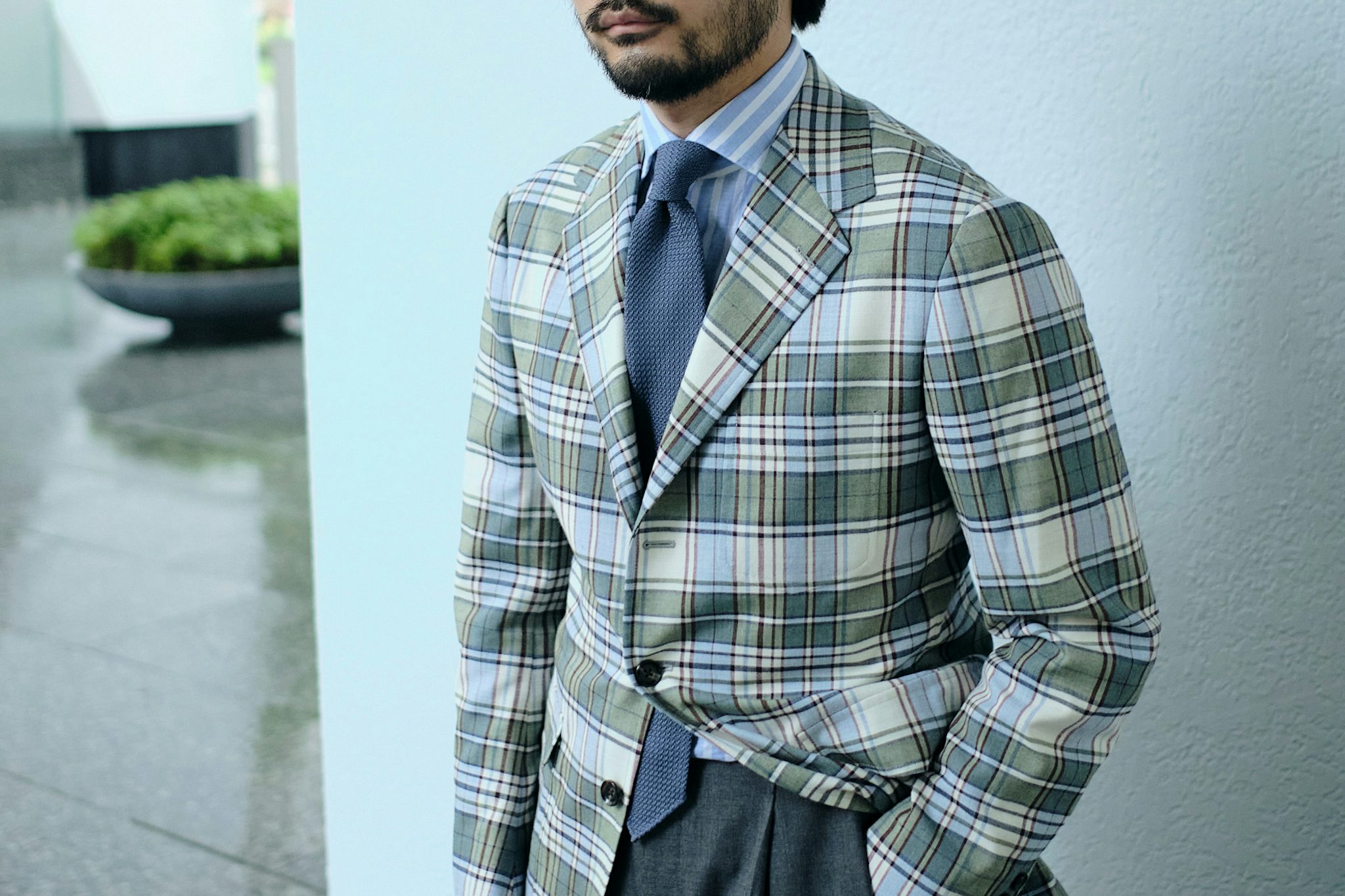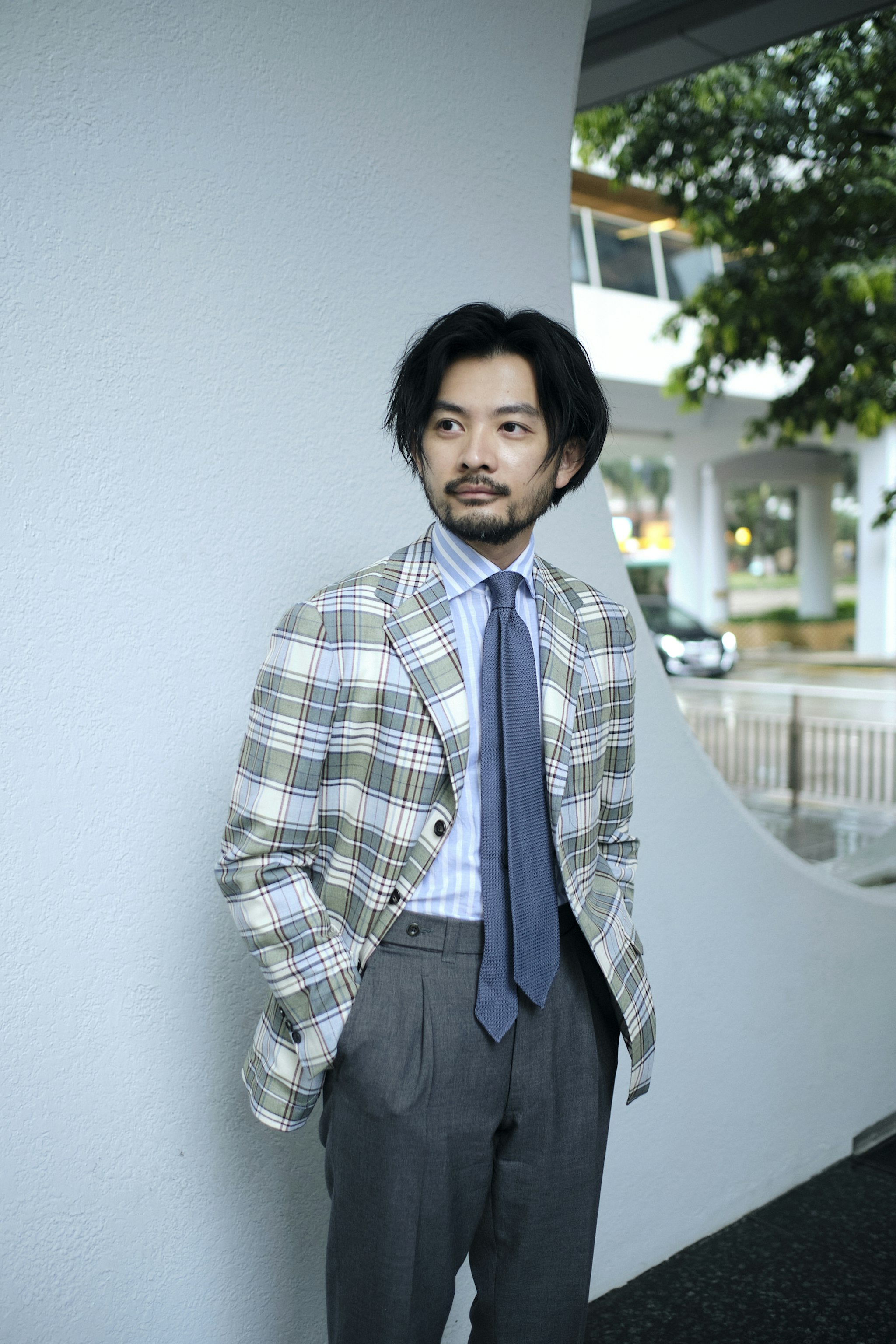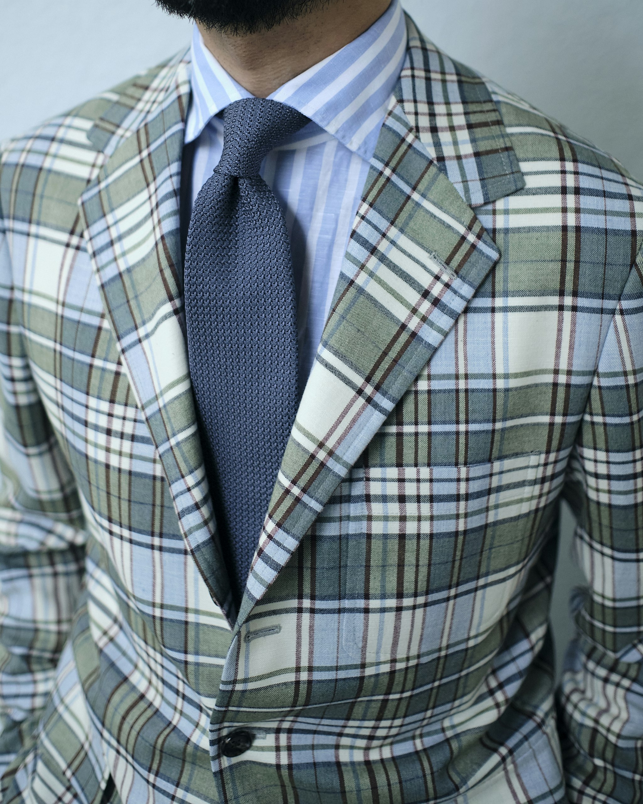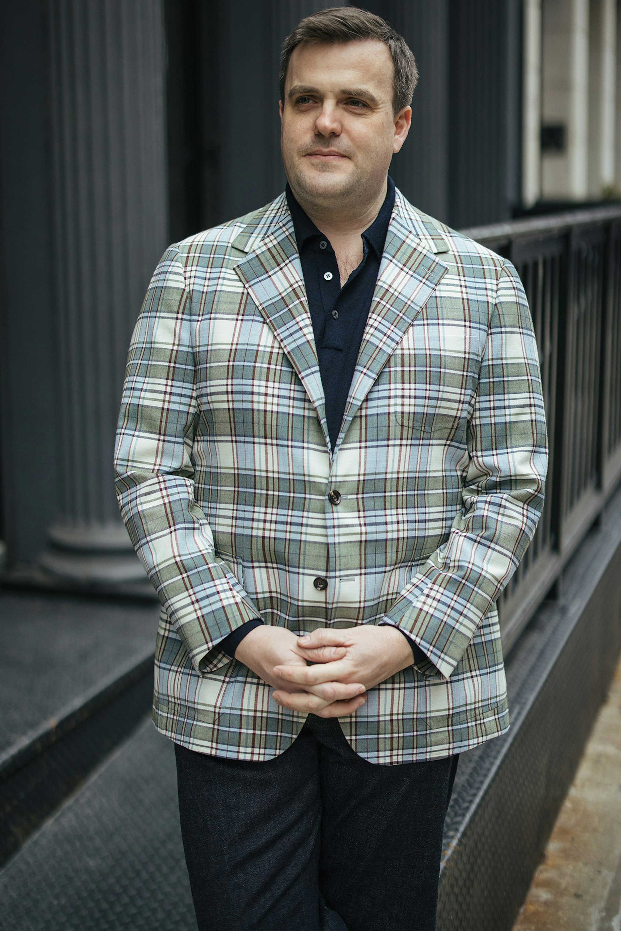 While Madras is often made up in lightweight cotton, our jacket is made from 60% Merino wool and 40% Cotton. The high-twist nature of this cloth make it an excellent option for warmer weather. Jan has paired his jacket with classic grey high-twist pleated trousers and a grenadine tie.