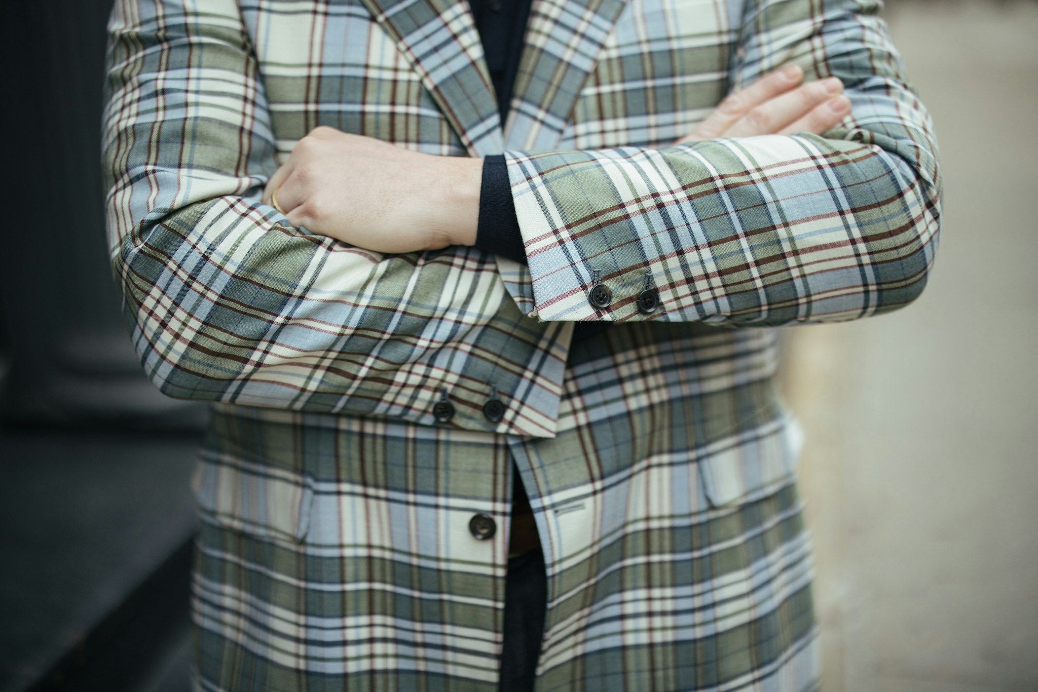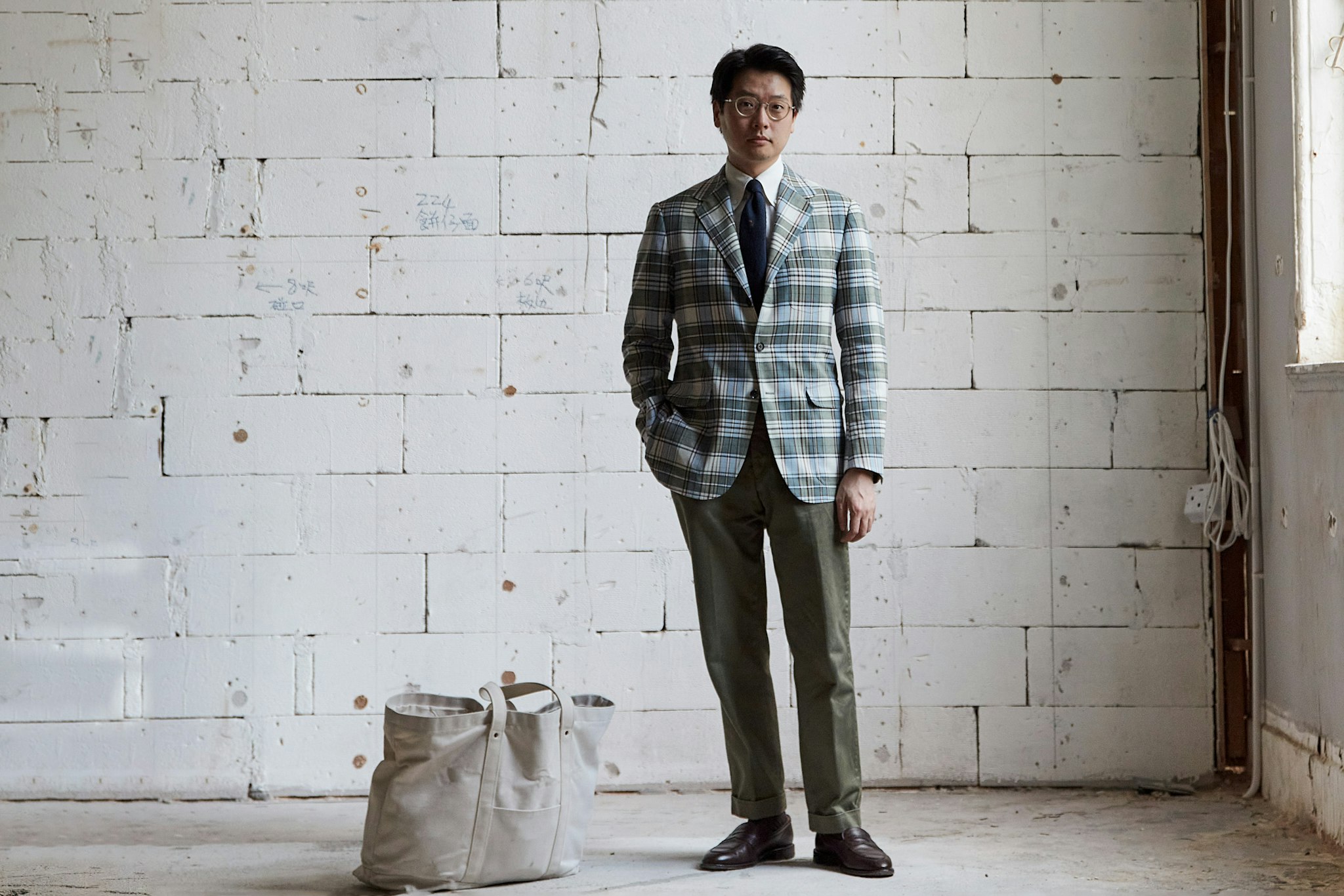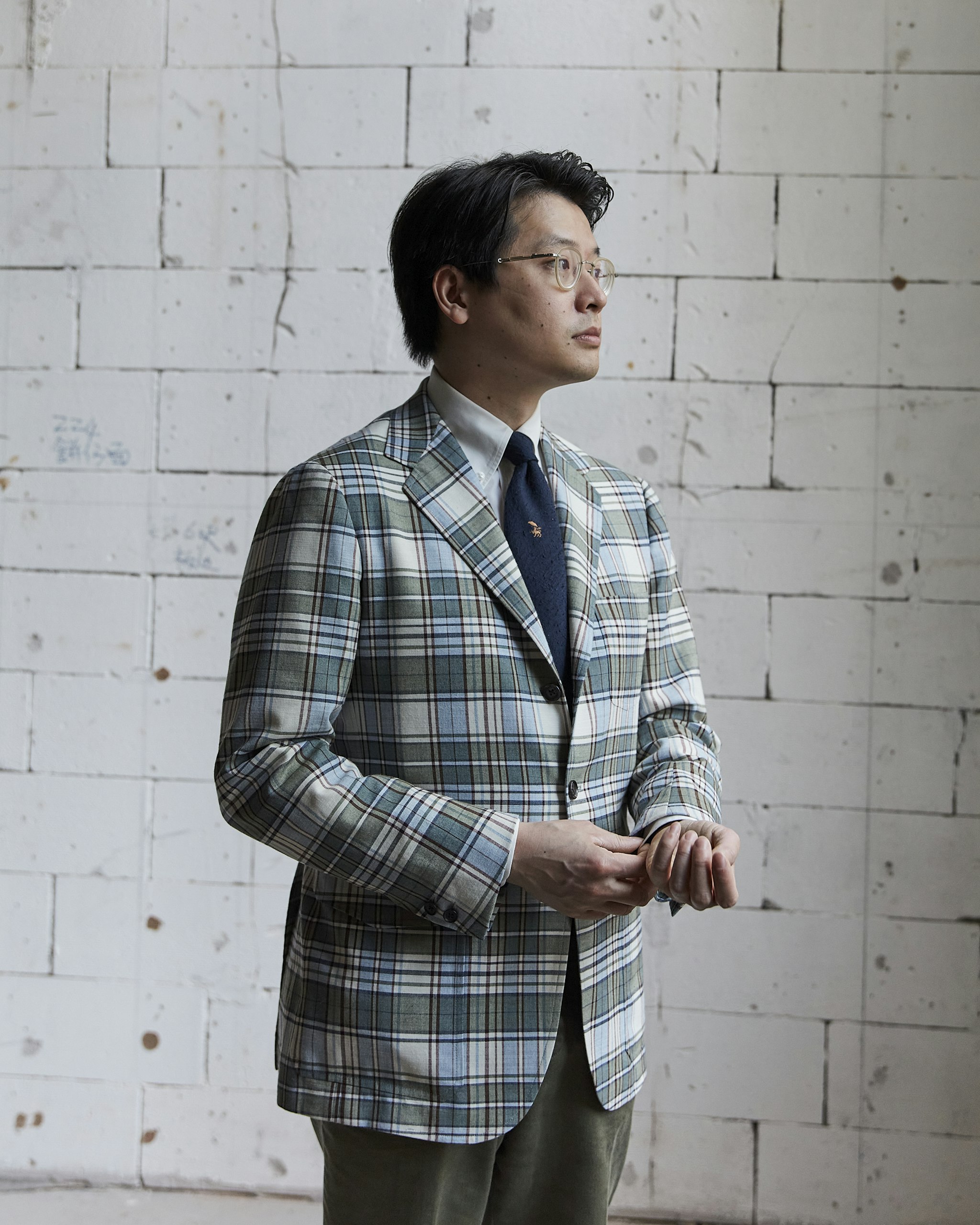 While Madras is often made up in lightweight cotton, our jacket is made from 60% Merino wool and 40% Cotton. The high-twist nature of this cloth make it an excellent option for warmer weather. Jan has paired his jacket with classic grey high-twist pleated trousers and a grenadine tie.