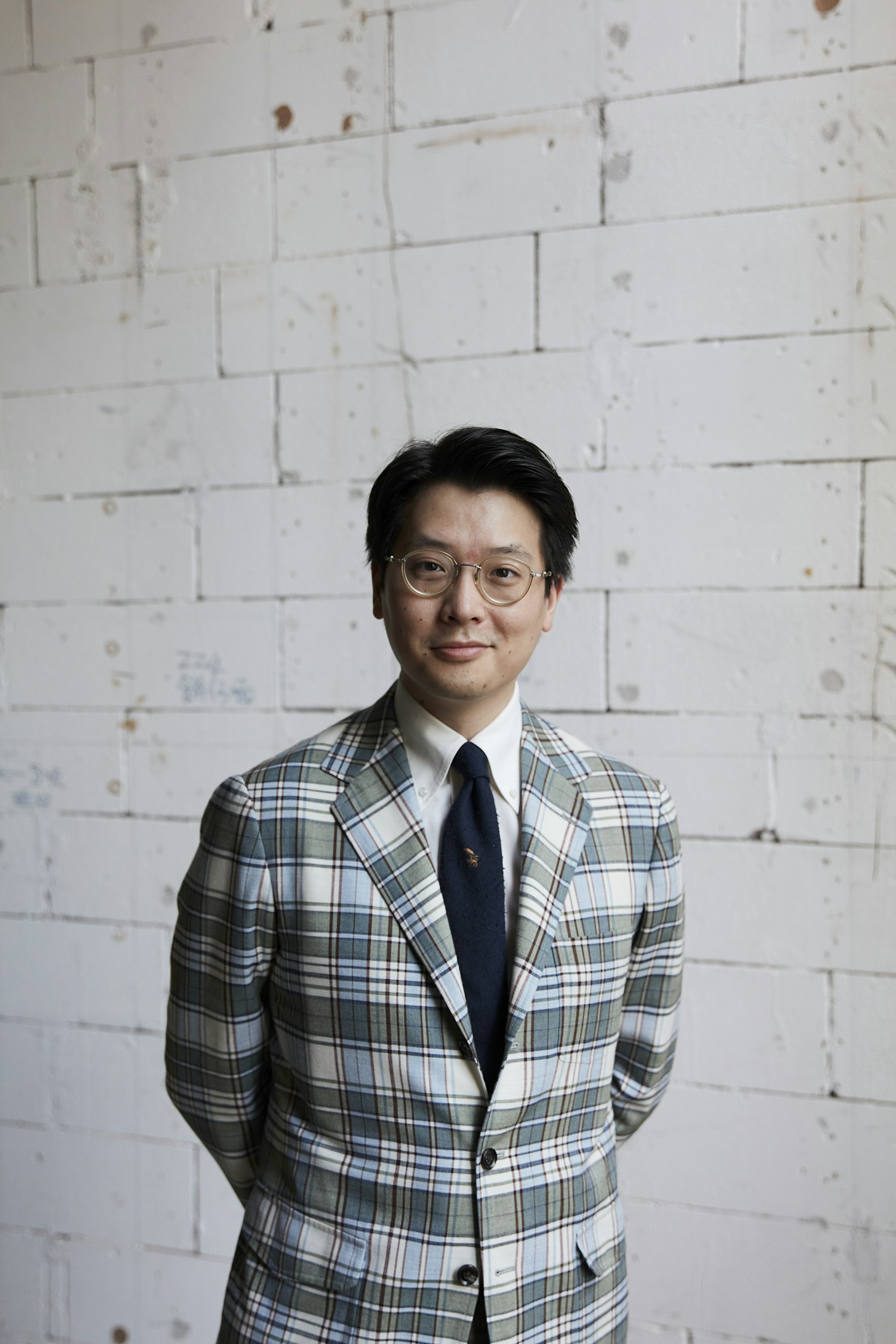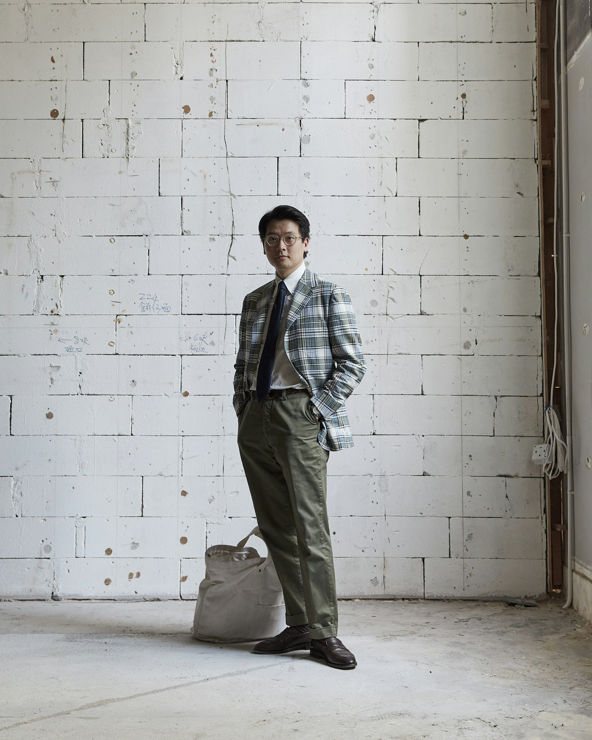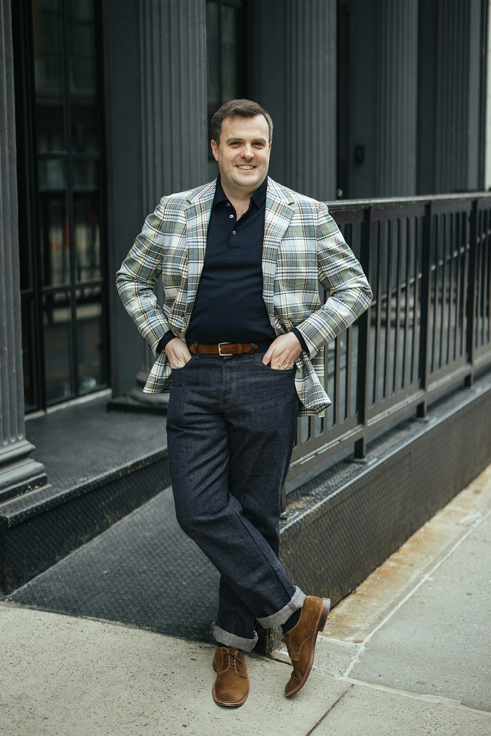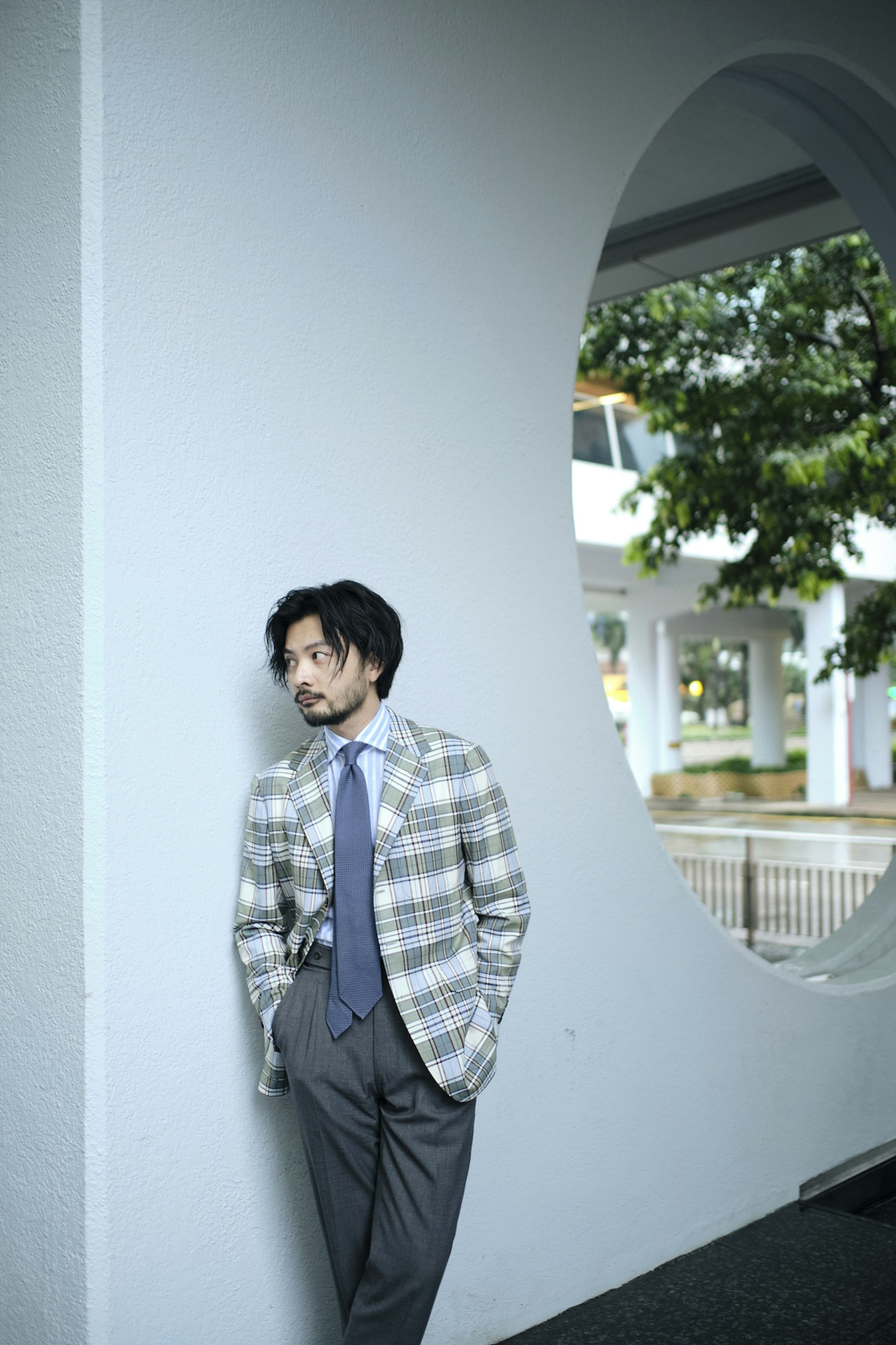 While Madras is often made up in lightweight cotton, our jacket is made from 60% Merino wool and 40% Cotton. The high-twist nature of this cloth make it an excellent option for warmer weather. Jan has paired his jacket with classic grey high-twist pleated trousers and a grenadine tie.