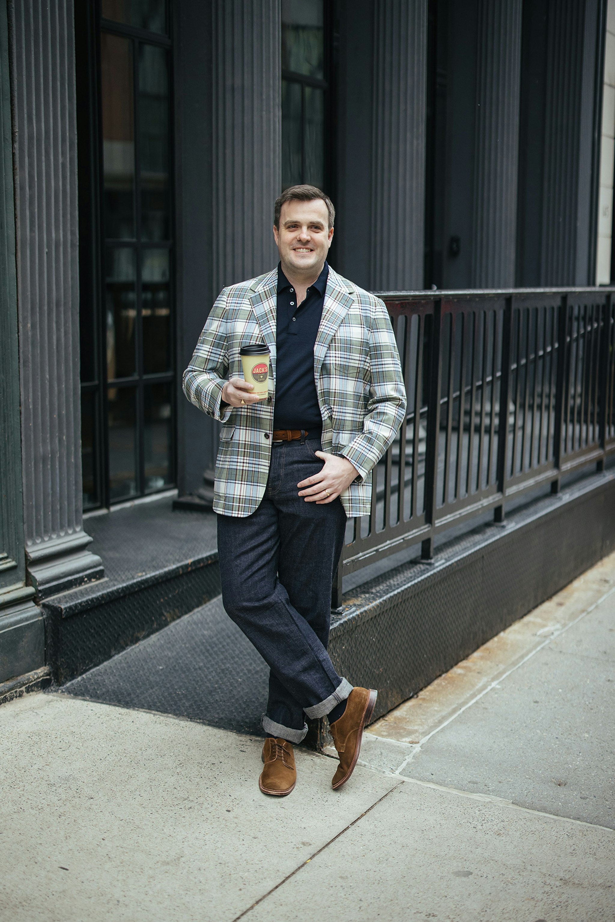 Daniel is wearing this season's house Model 11, which complements the typically ivy style cloth. In our most casual look of the three, he’s paired it with our Drumohr Knit Polo and denim from The Real McCoy's.