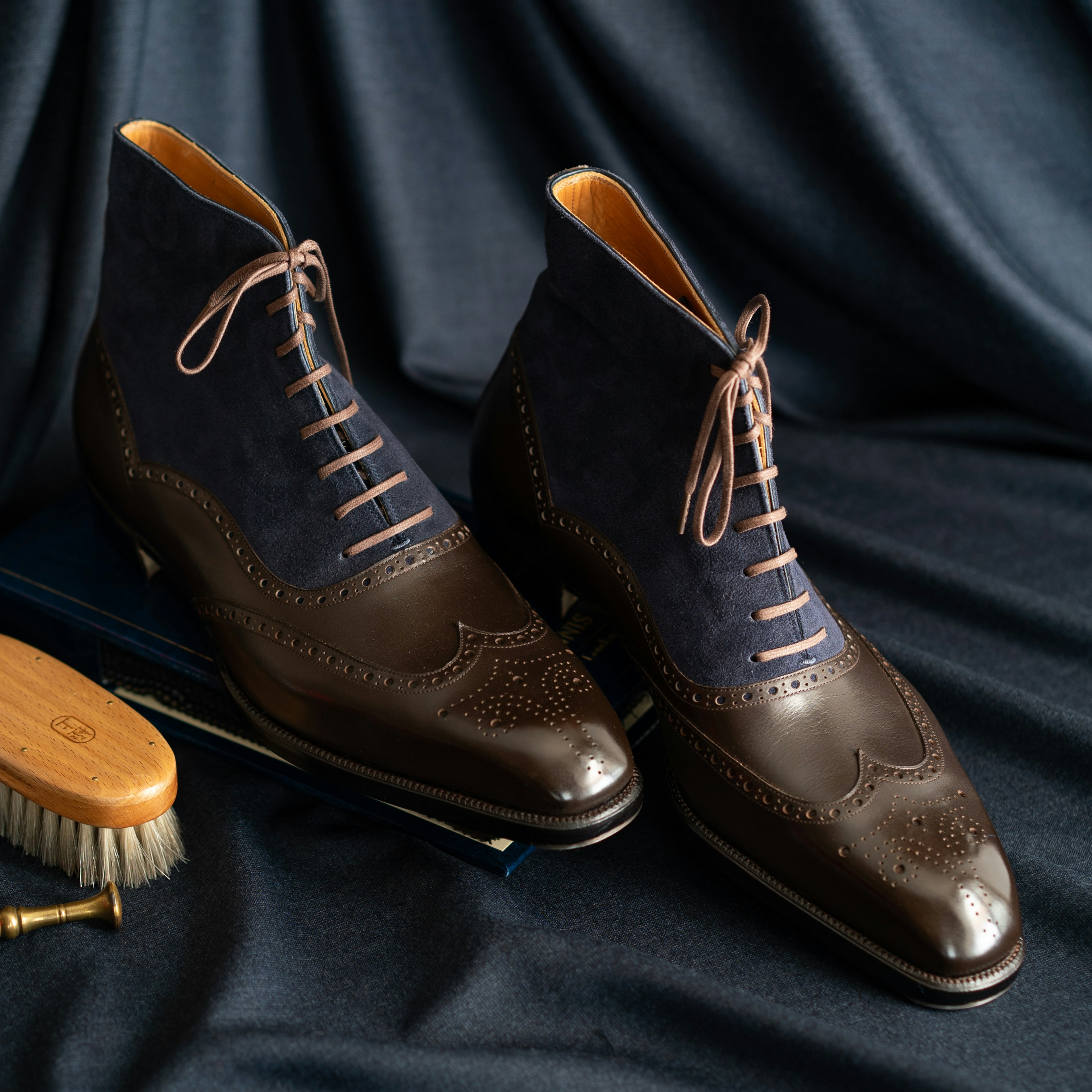 These wing-tipped boots combine brown suede with a mid-brown calf and feature Koji's signature hand-sewn tack at the throat. The soles are made of leather with a flush rubber topy and metal toe taps.