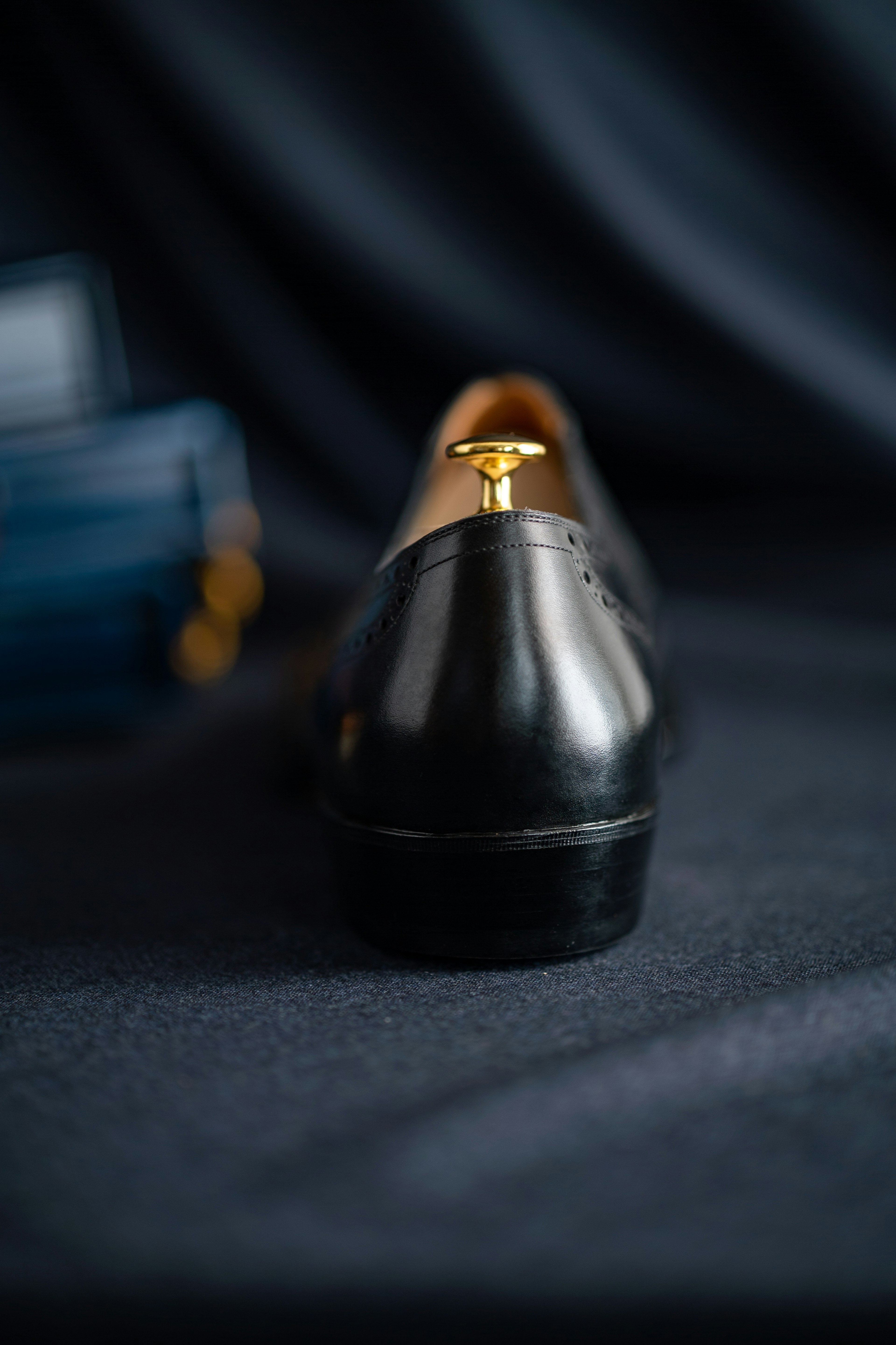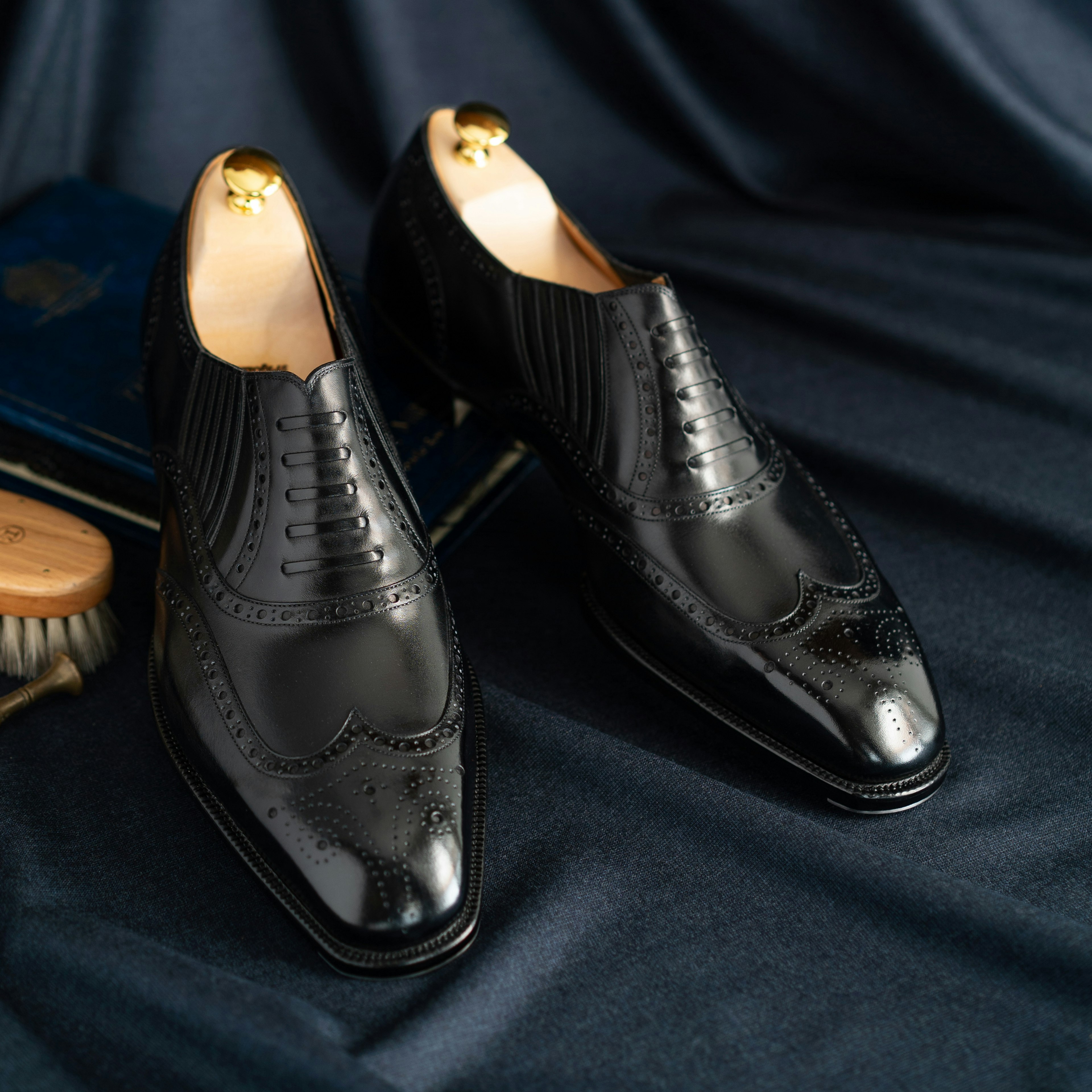 This pair of black calf wingtips uses elastic side panels to create the look of a full lace up shoe with the benefits of a loafer. The “laces” themselves are made from the same black leather. Note the heel cup of these shoes are slightly angled to form fit the wearers heel.
