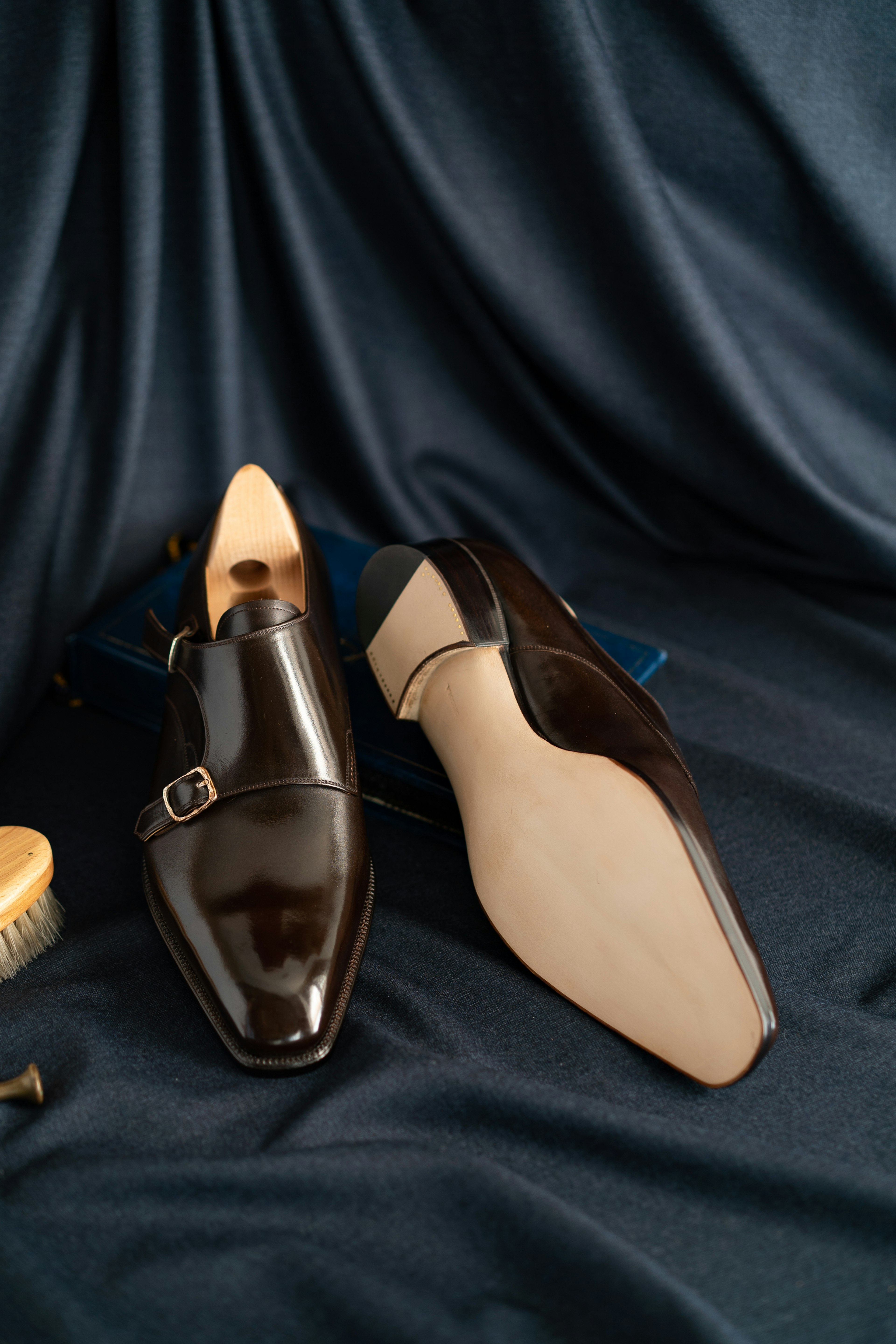 These double-monk strapped shoes are made in a dark brown calfskin with hammered buckles. Koji waits to perforate the strap holes until the final delivery to ensure the best possible fit.
