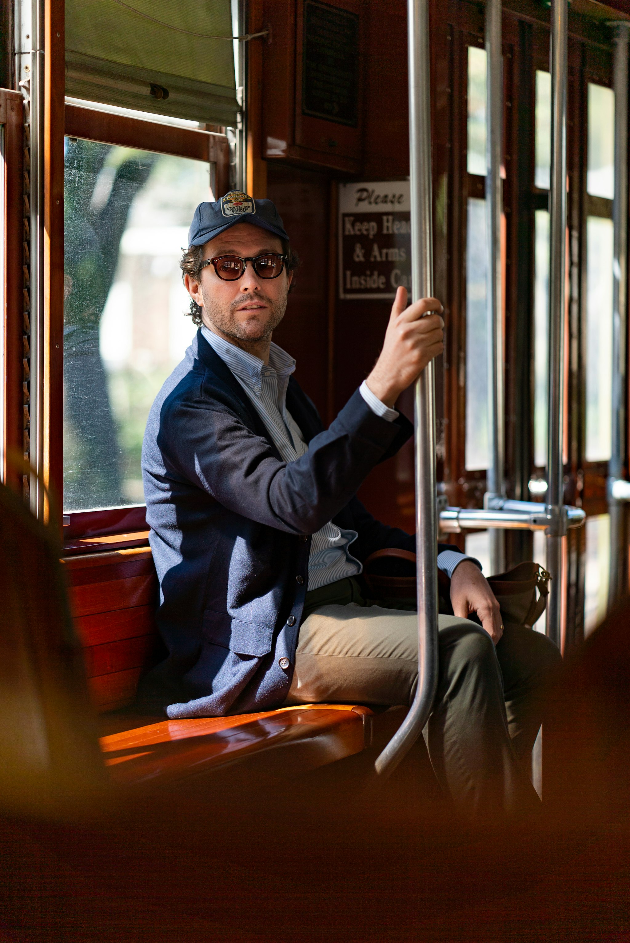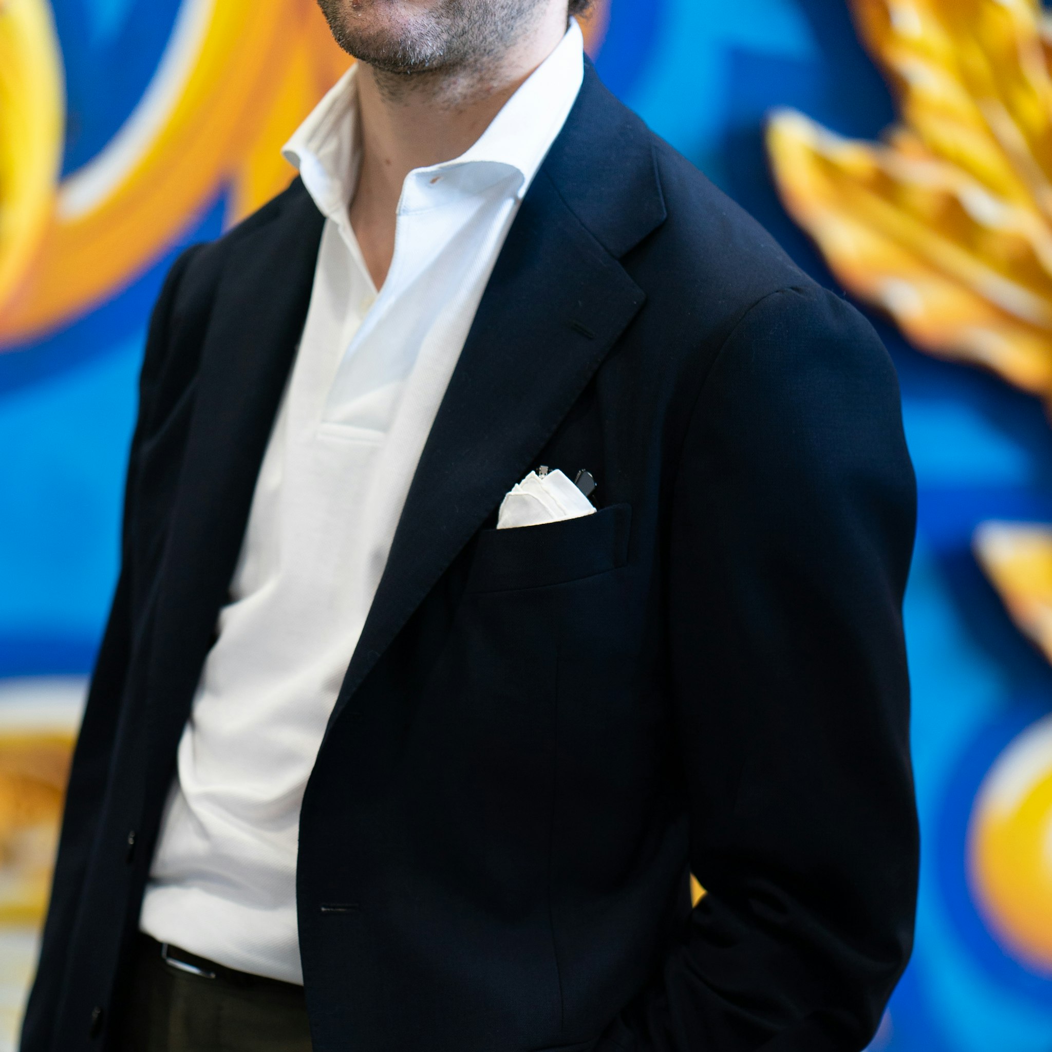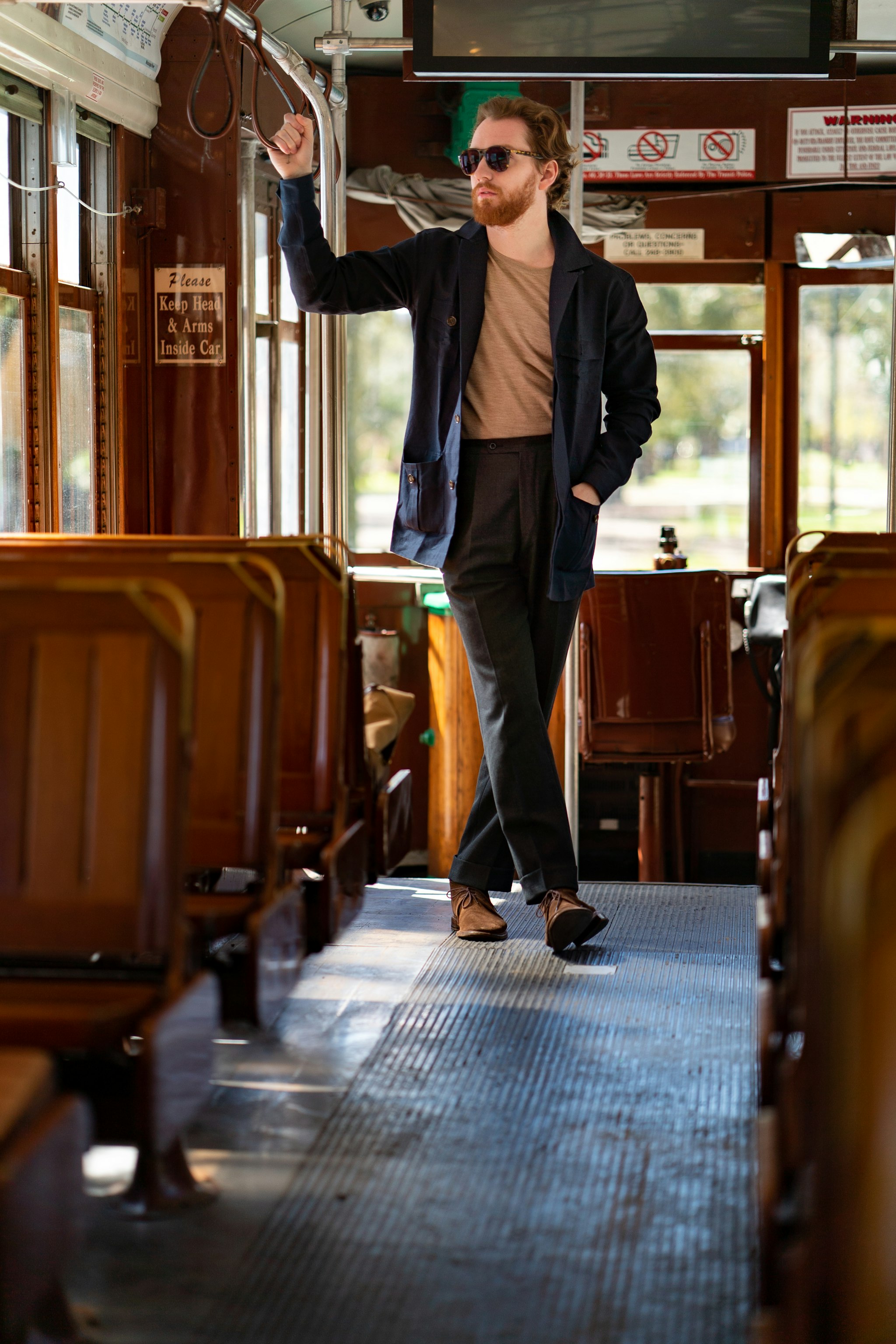 The Armoury's own Model 3 suit features the same extended, unpadded shoulders and enlarged sleevehead as our Model 3 sport coat. Worn here as a separate, it makes for a great travel piece.