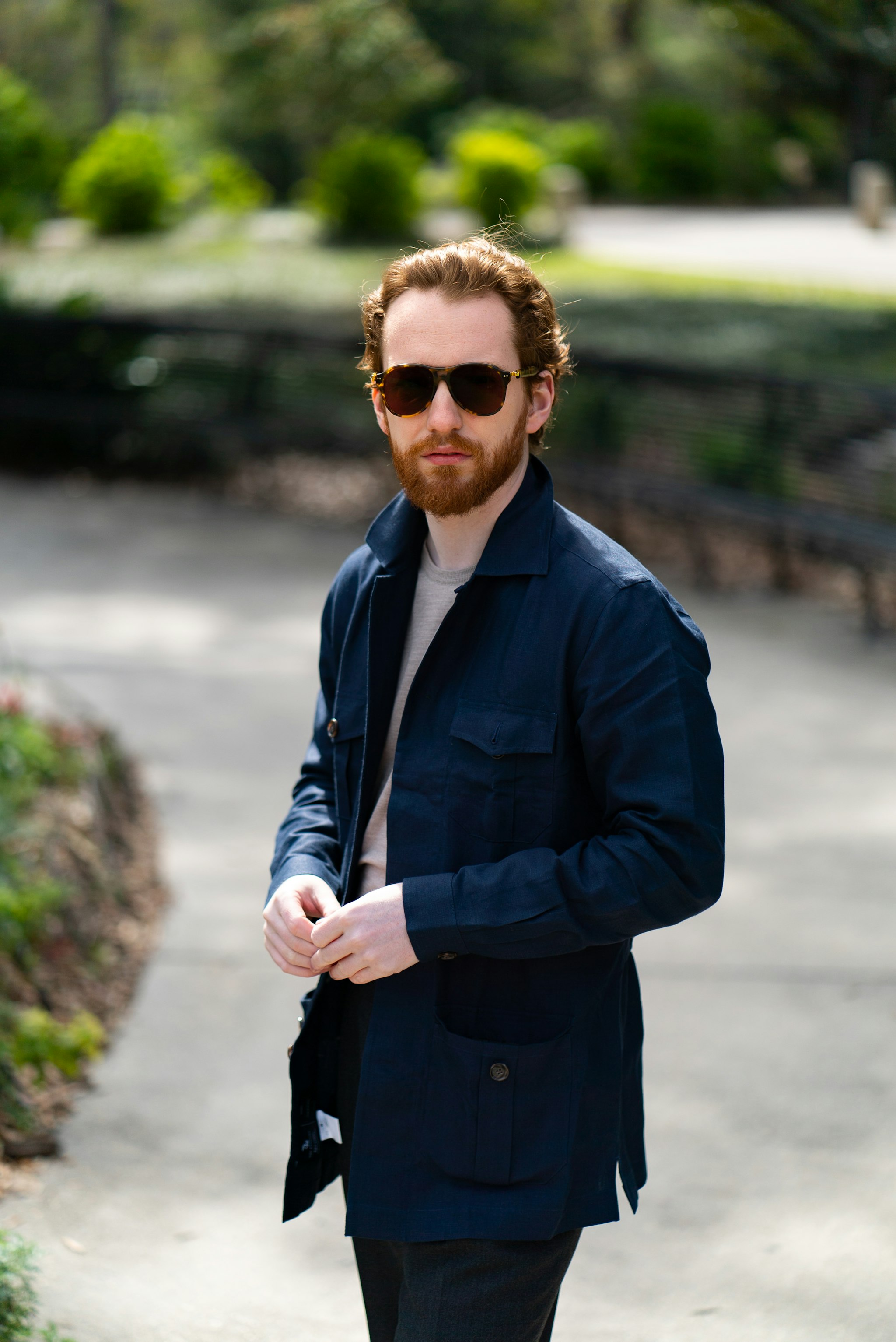 This jacket comes equipped with bellowed pockets, a half belt with side button tabs, and an inverted back pleat for greater movement in the arms. Finished with horn buttons, this safari jacket serves as a cool jacket to wear during the spring and summer.