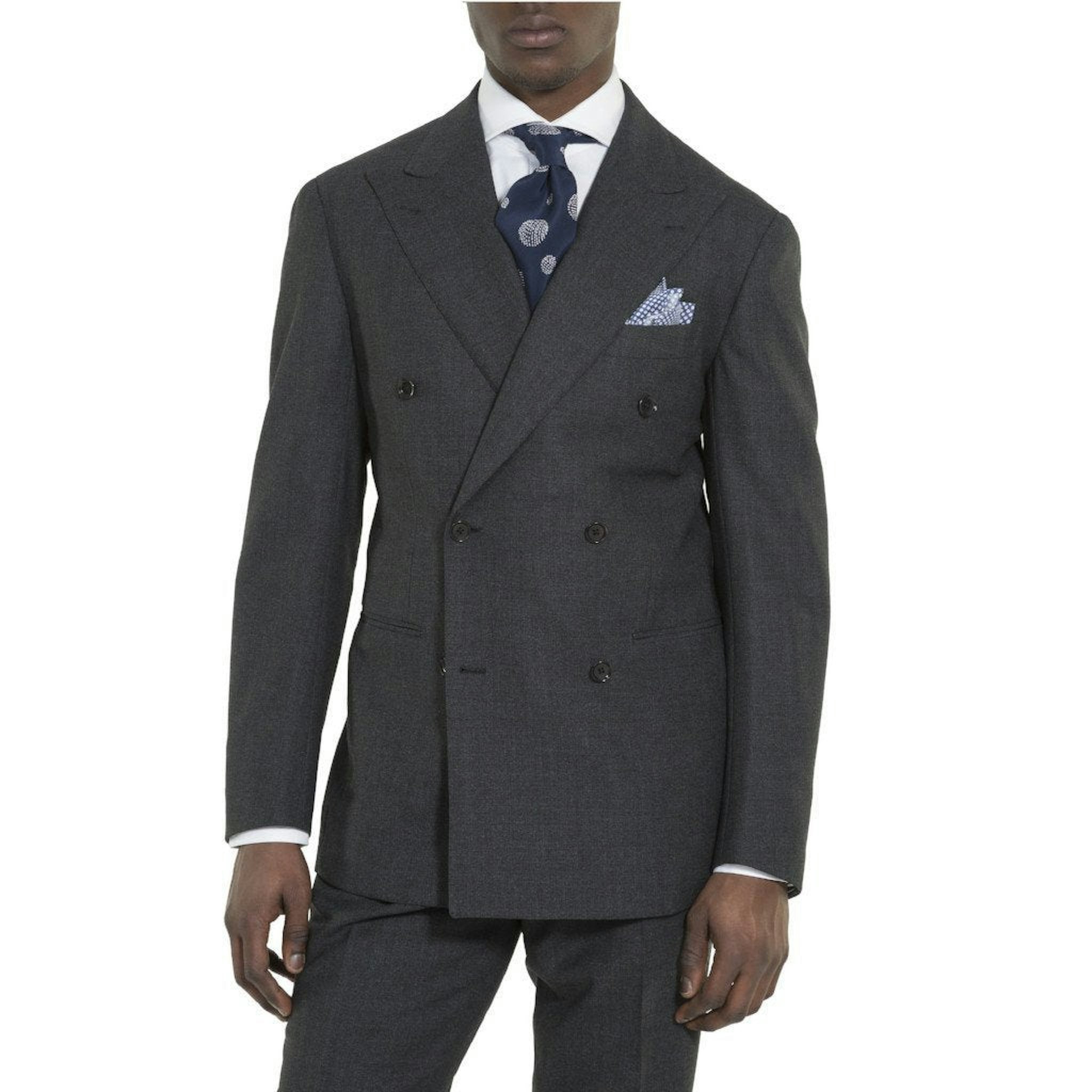 The Armoury's Model 6 double breasted suit features a lower, more horizontal lapel that sweeps out wide and straight, it's incredibly classic and wearable. The Model B trousers can also be worn on their own.