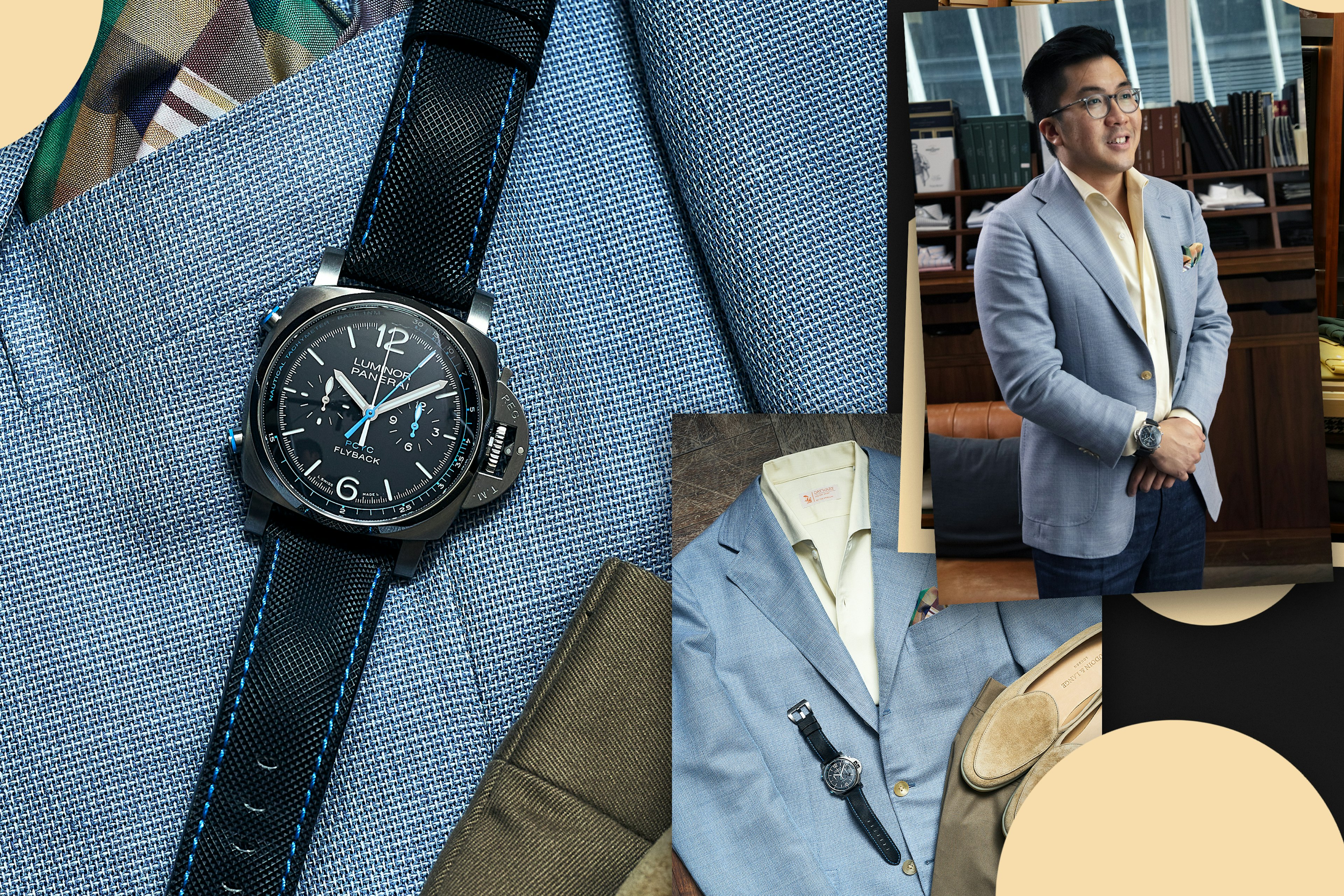We echoed the Panerai’s blue hands, tachymeter track and pushers with Ziyong’s pale blue sport coat.