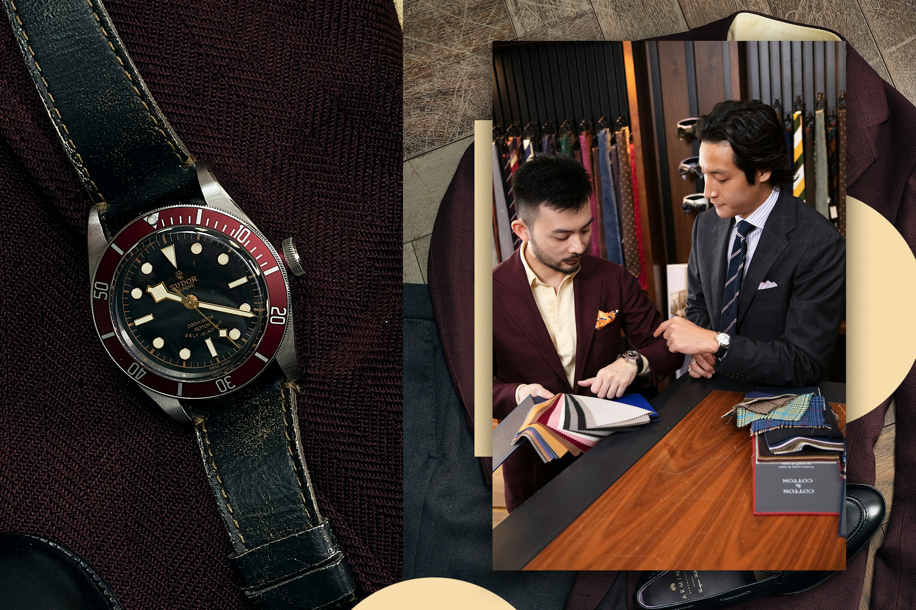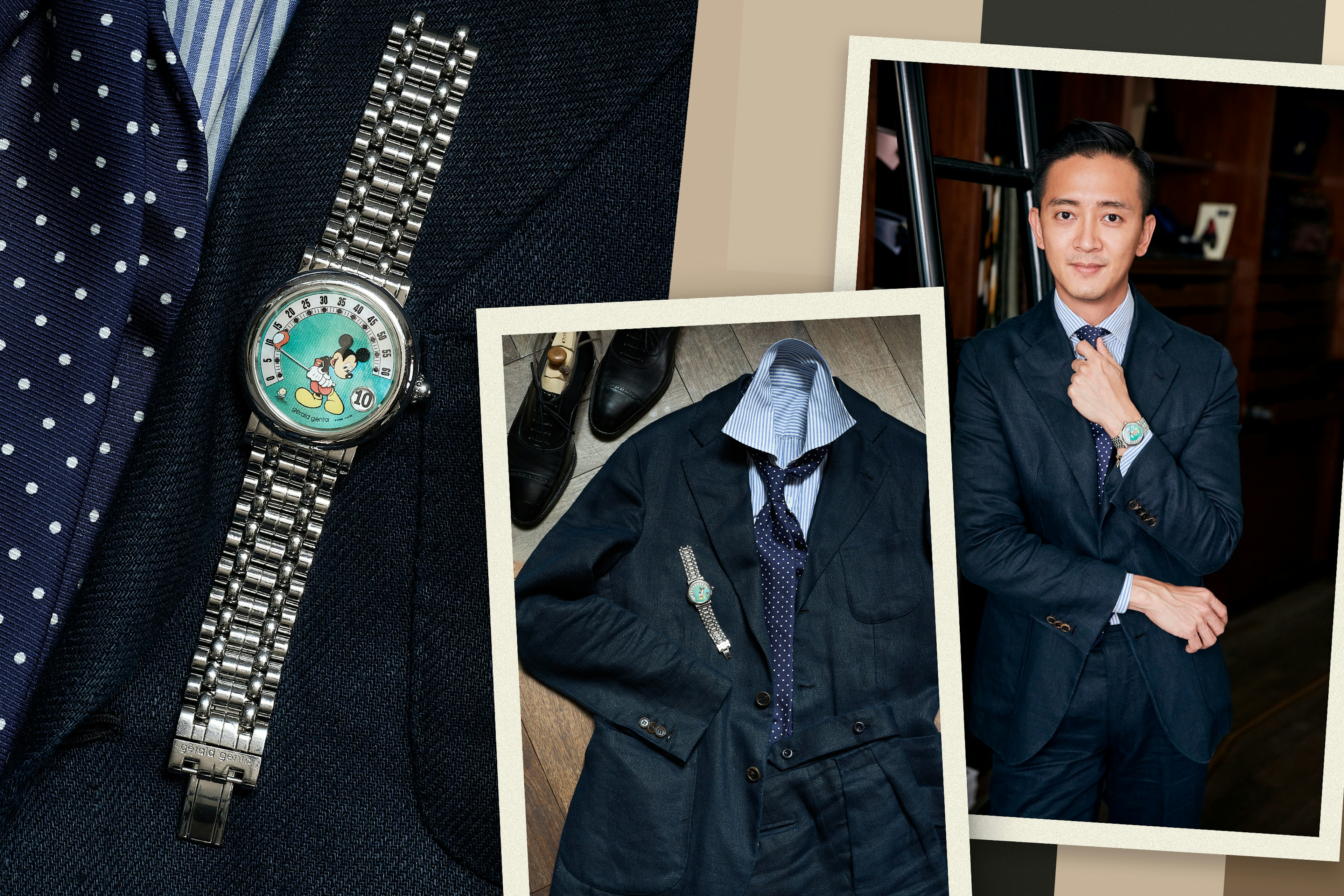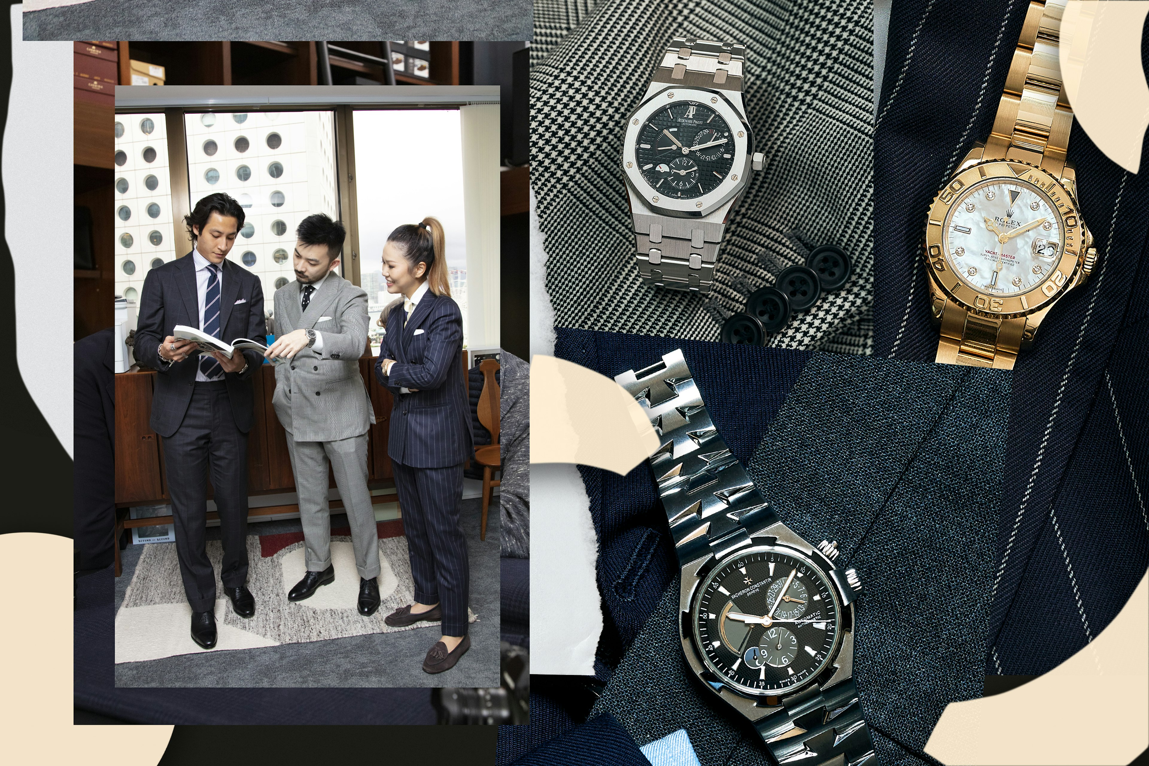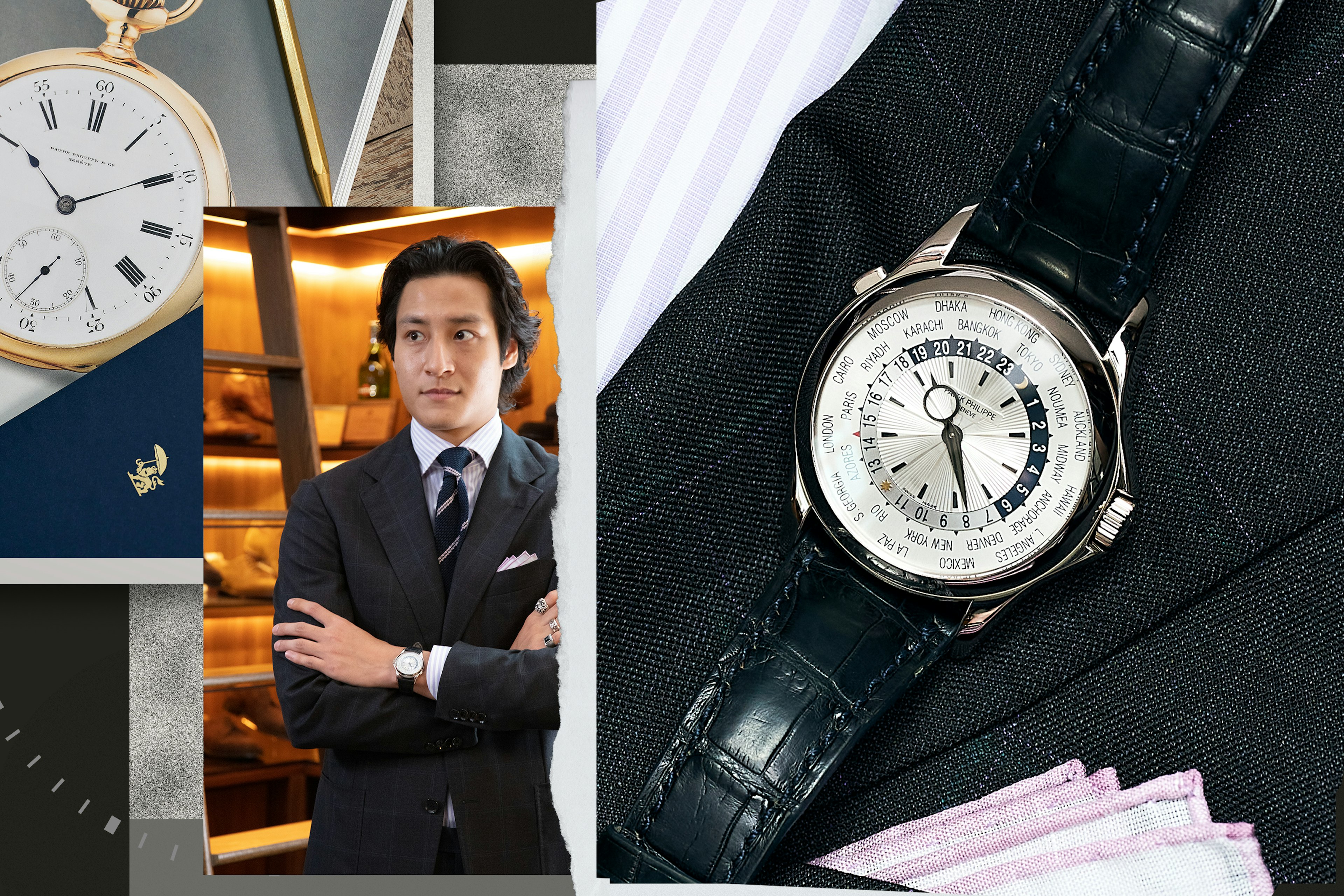 We used fine, subtle patterns in Shoyo’s suit and shirt to emphasize the starburst guilloche of this Patek Philippe World Time.
