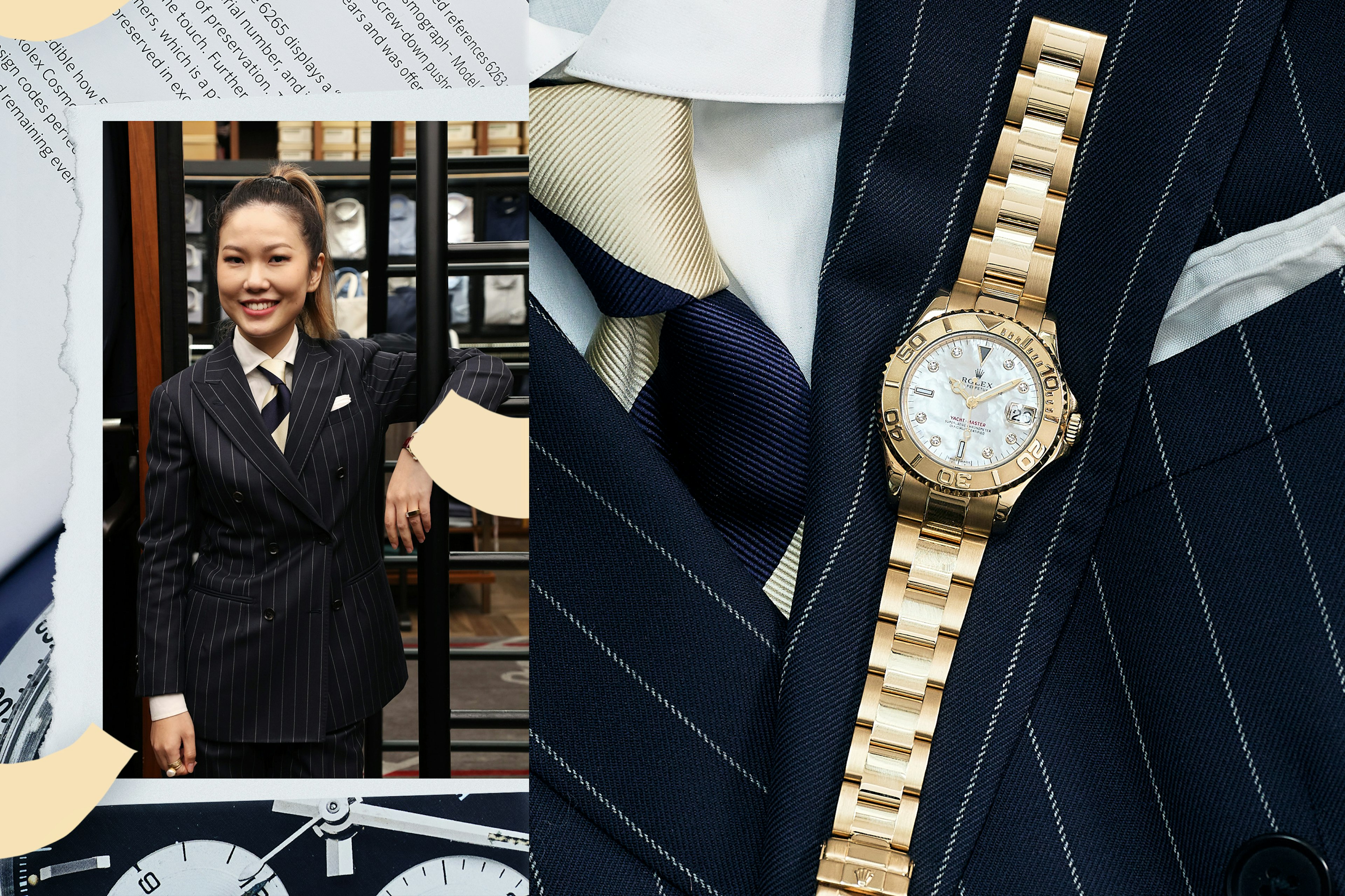 We surrounded Alice’s Rolex Yacht-Master with a pinstripe suit, drawing out the lustre of the mother-of-pearl dial.