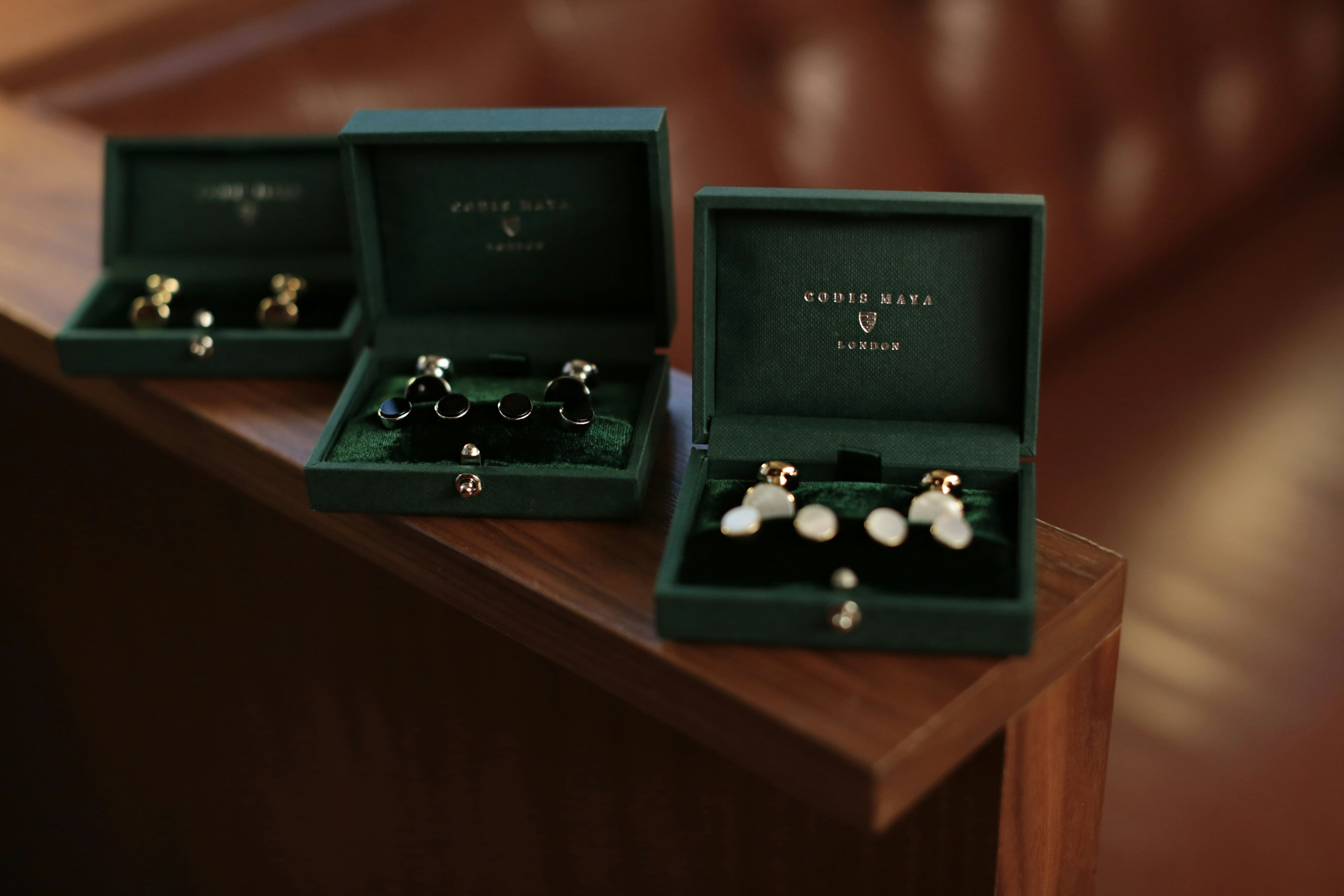 Men's tailoring is often made personal through the small, discrete choices in its accessories -- the tie, the watch, and sometimes cufflinks. For formalwear, your neckwear should be a black bow tie made from the same material as your jacket's facings. Cufflinks, as we mentioned, can also be a good way to mark the occasion. And if you're wearing a traditional tuxedo shirt, you will need a dress set (ours are made from a simple black onyx).