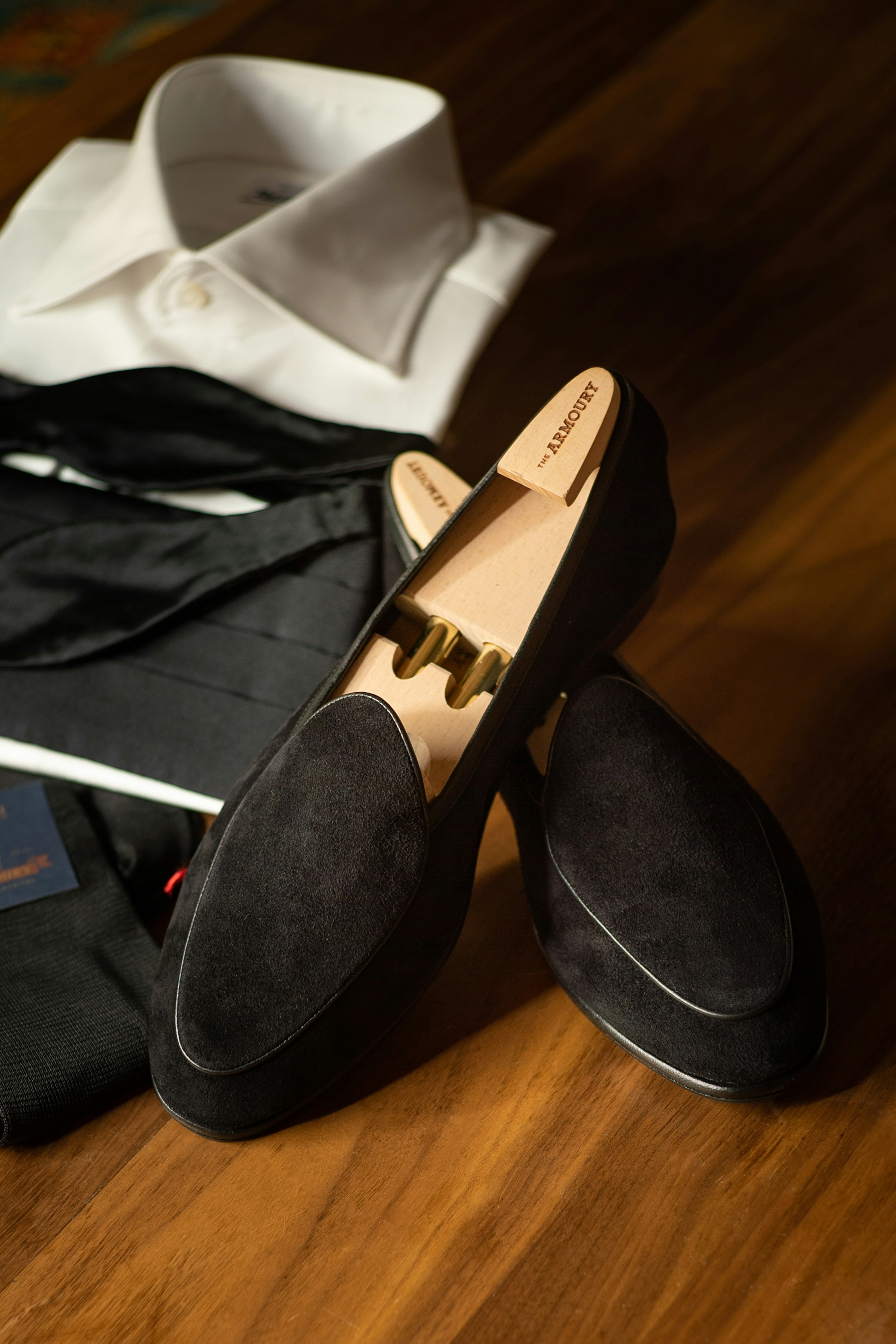 Traditional formal footwear is usually a choice between black plain toe oxfords or patent leather opera pumps, but Mark says he's been surprised by how much he likes black suede these days. "I'll often wear black suede wholecuts with my evening wear, or my black suede Baudoin & Langes." Like the tuxedo itself, both styles are distinguished by their simplicity, which helps underscore the elegance of the rig.