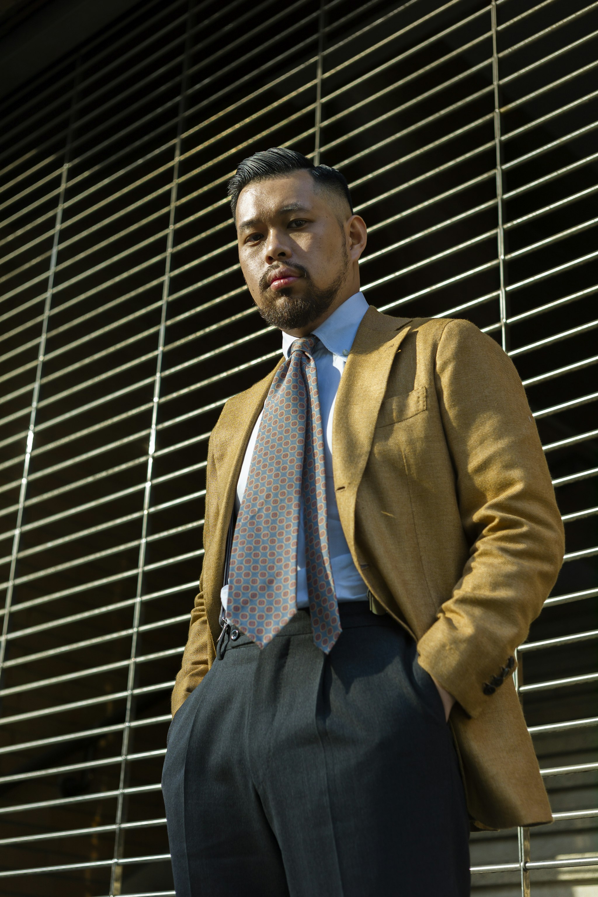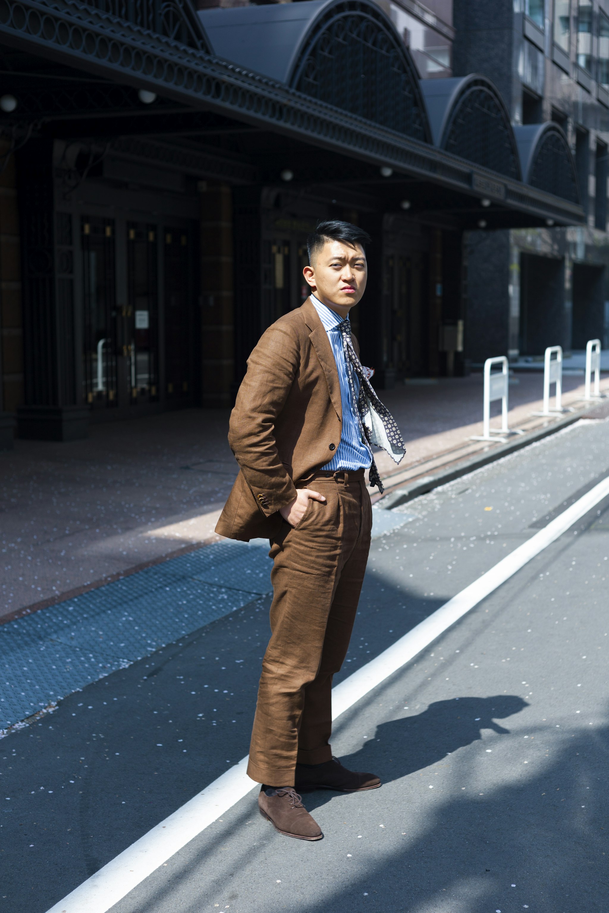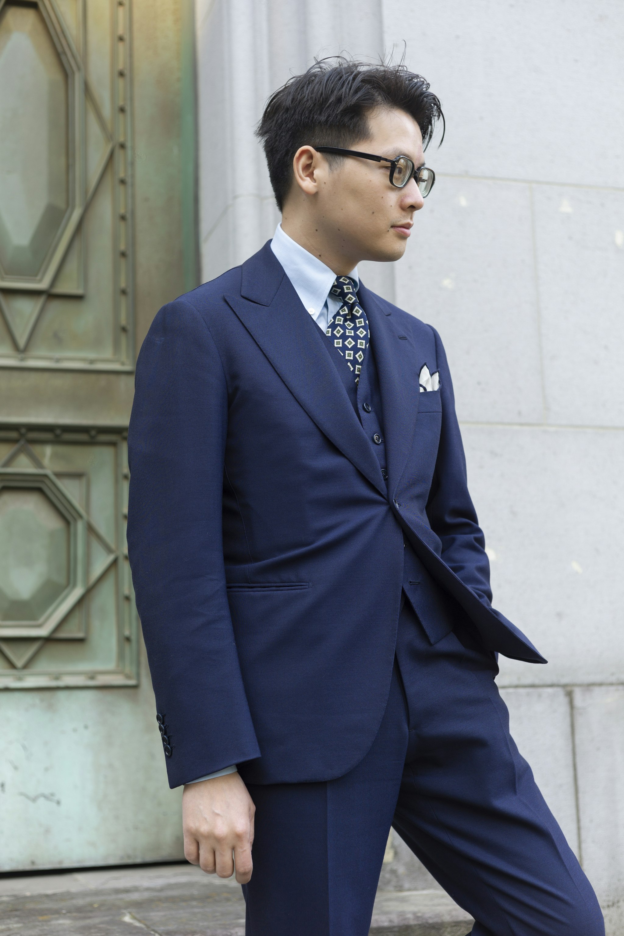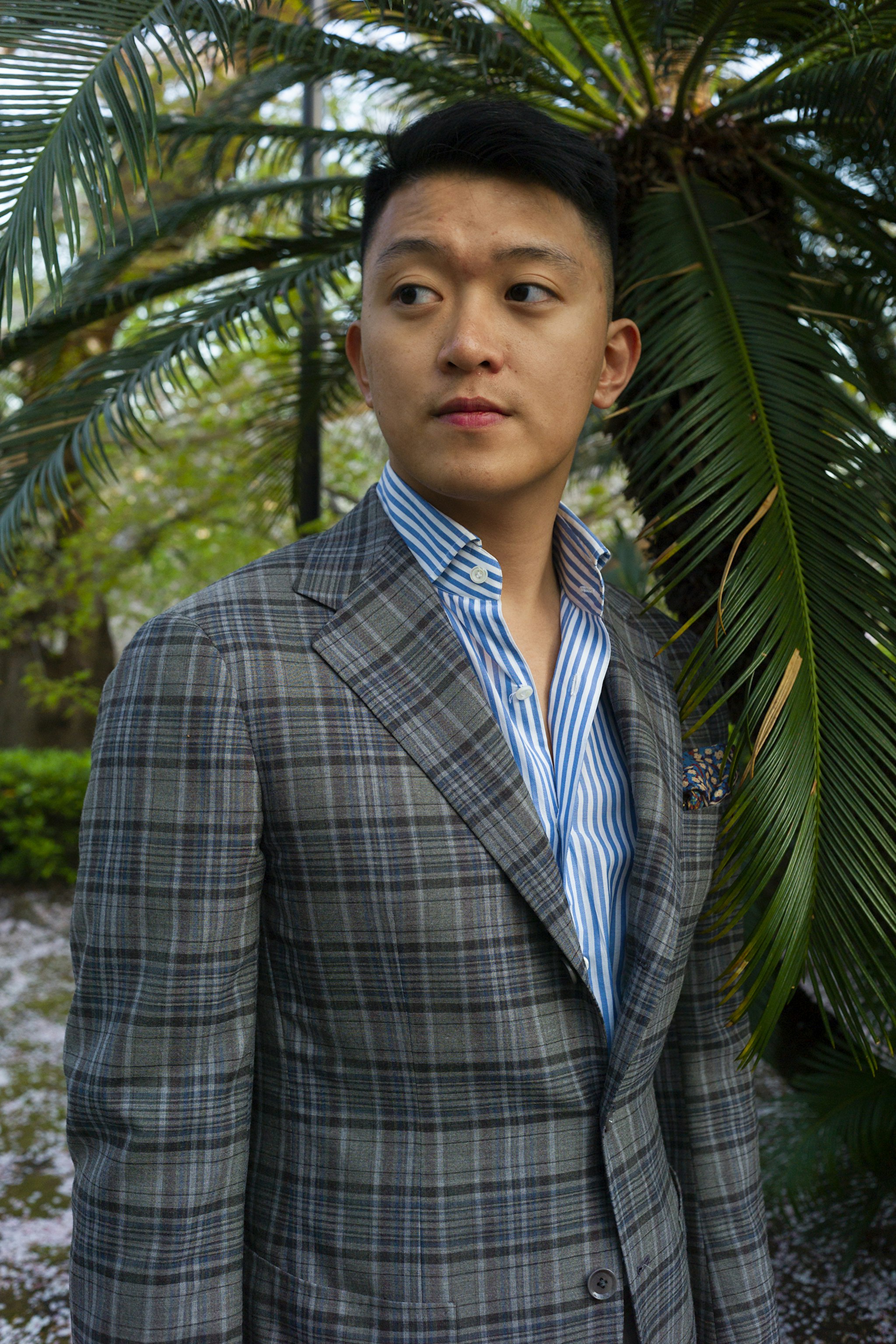 Jan is wearing a Made-to-measure Sport Coat by Orazio Luciano, available for commission year-round in both New York and Hong Kong. The Bespoke trousers by Ambrosi Napoli, are available for commission in Hong Kong. Tie and Pocket Square by Drake's.