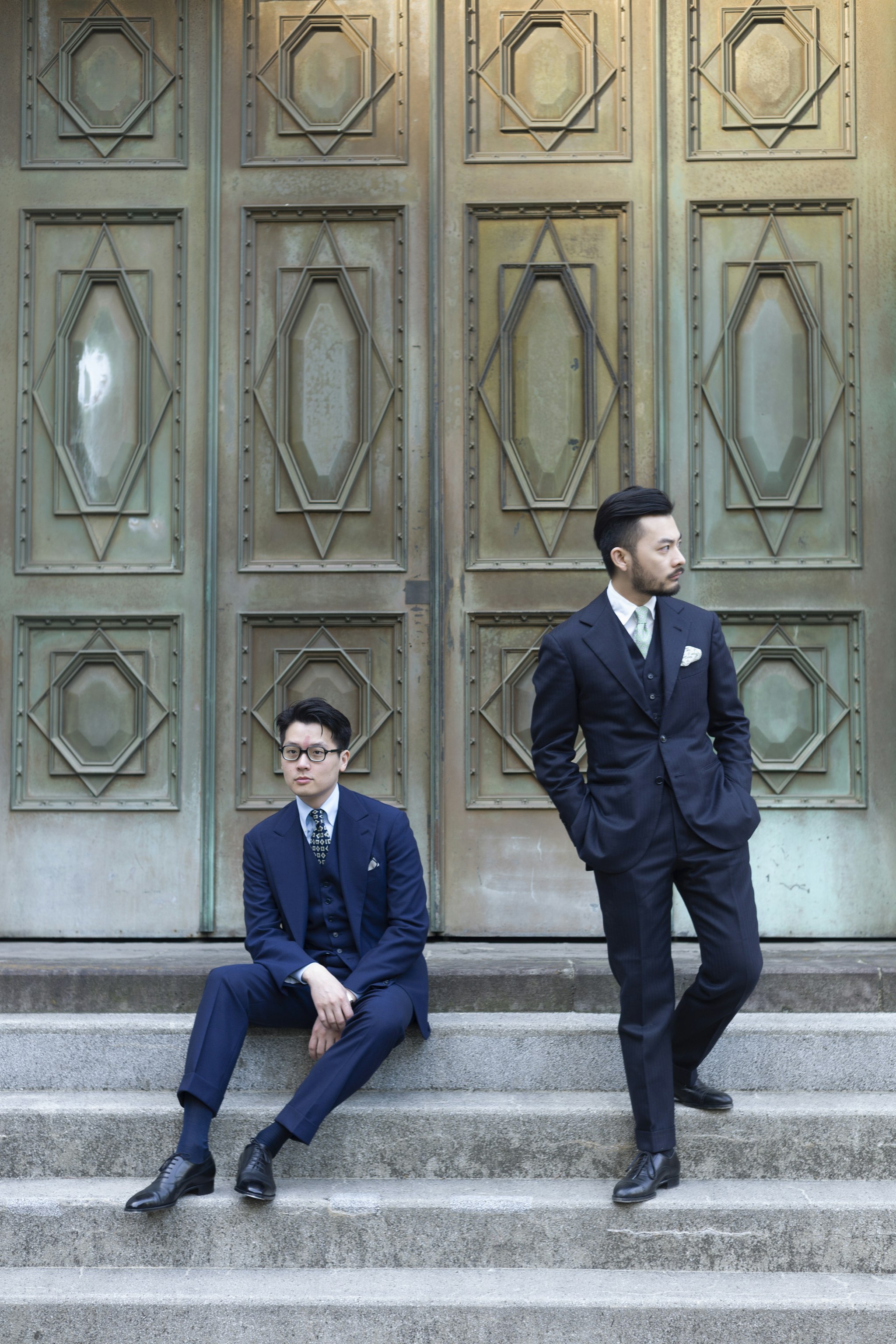 Mark and Jan are both wearing Liverano & Liverano Bespoke, available during trunk shows in both New York and Hong Kong.