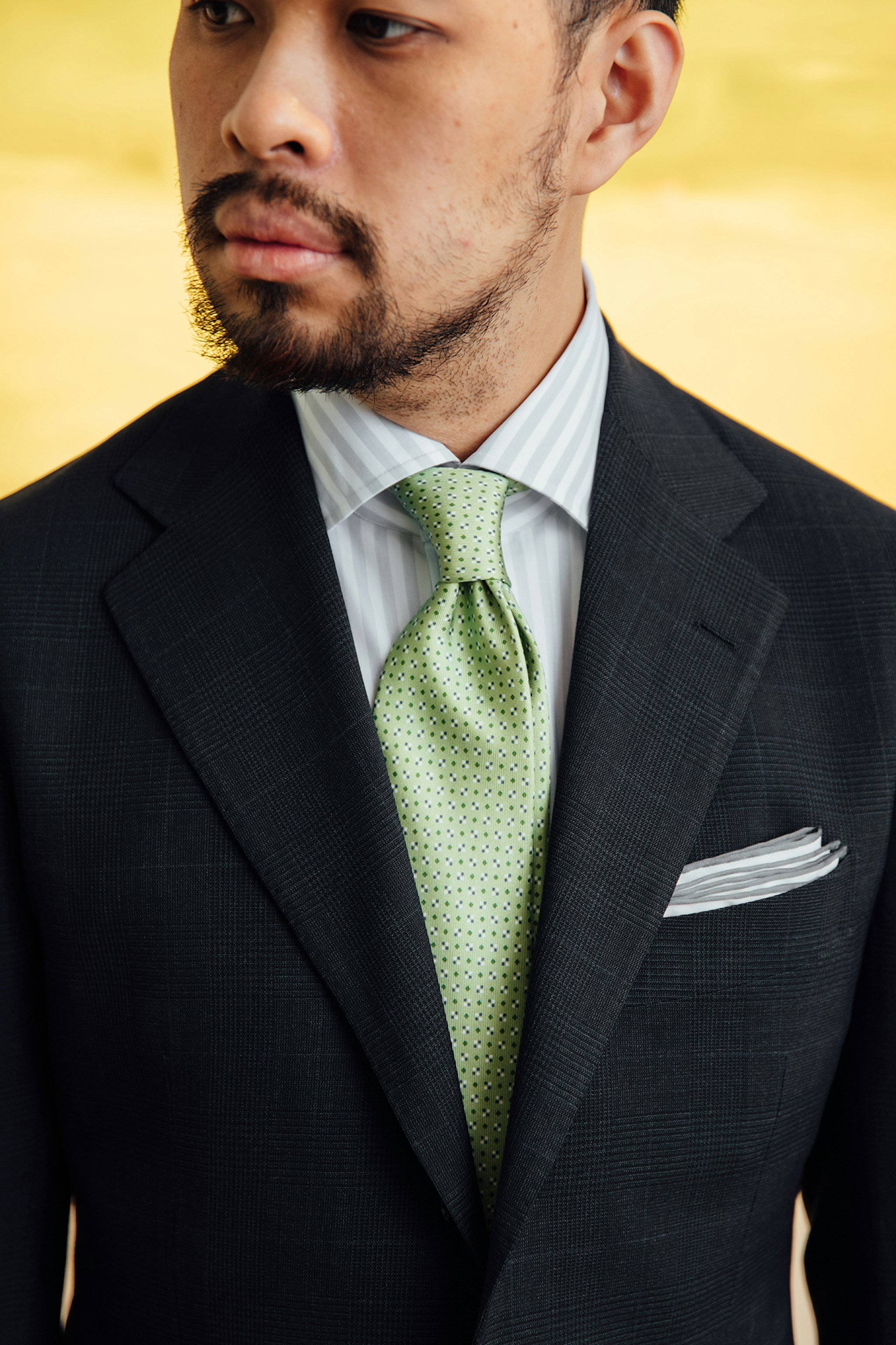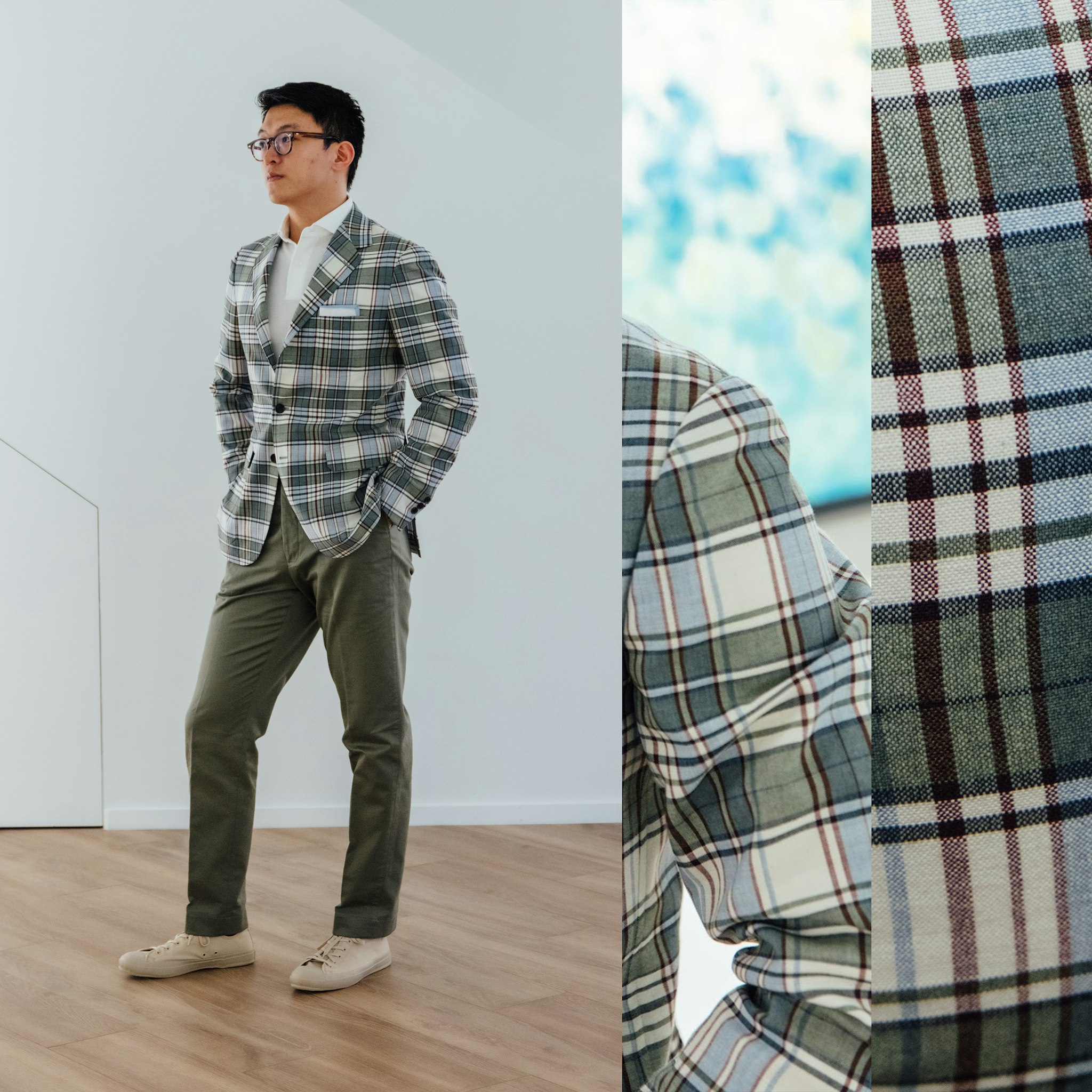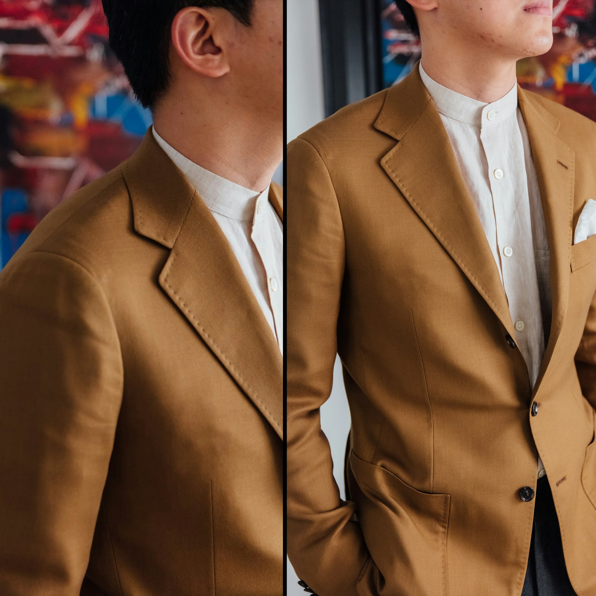 The Armoury's own Model 15 is a tribute to the great city of Florence. The jacket features a soft unpadded shoulder, with enough canvas and structure to give it added extension. One of the most prominent features of a Florentine style jacket is the lack of a front dart. This is achieved through use of an angled side dart, which hides cleanly behind the arm of the wearer, presenting a more sleek appearance. The round sweep from lapel notch to open quarters adds to the slightly rural, countrified appearance. The jacket is is slightly shorter, with the notch and breast pocket traditionally low. This silk mid-brown glen check is woven by Ermenegildo Zegna, perfect for the warmer months.