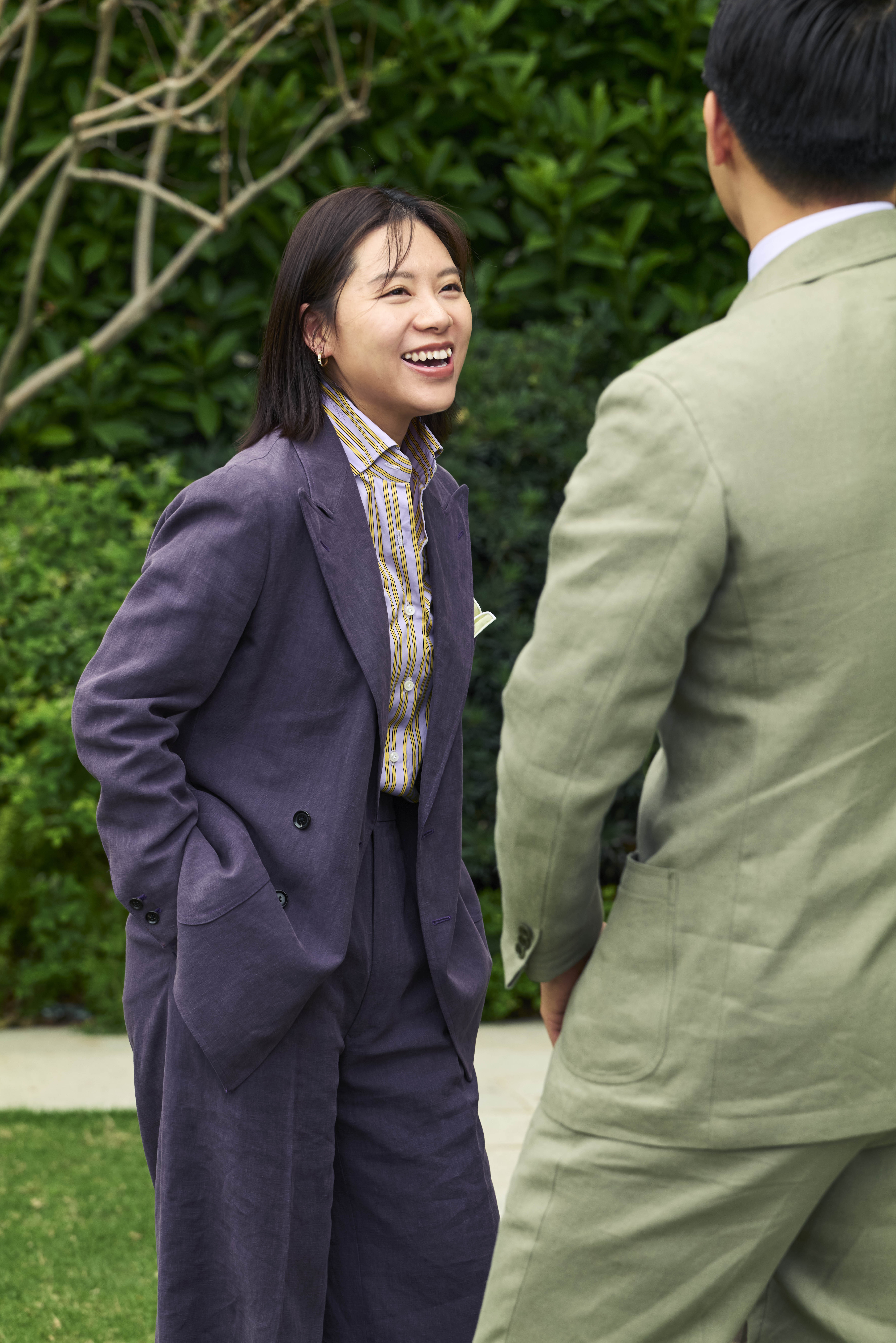 Jackie & Kian in made-to-measure Ring Jacket suits.