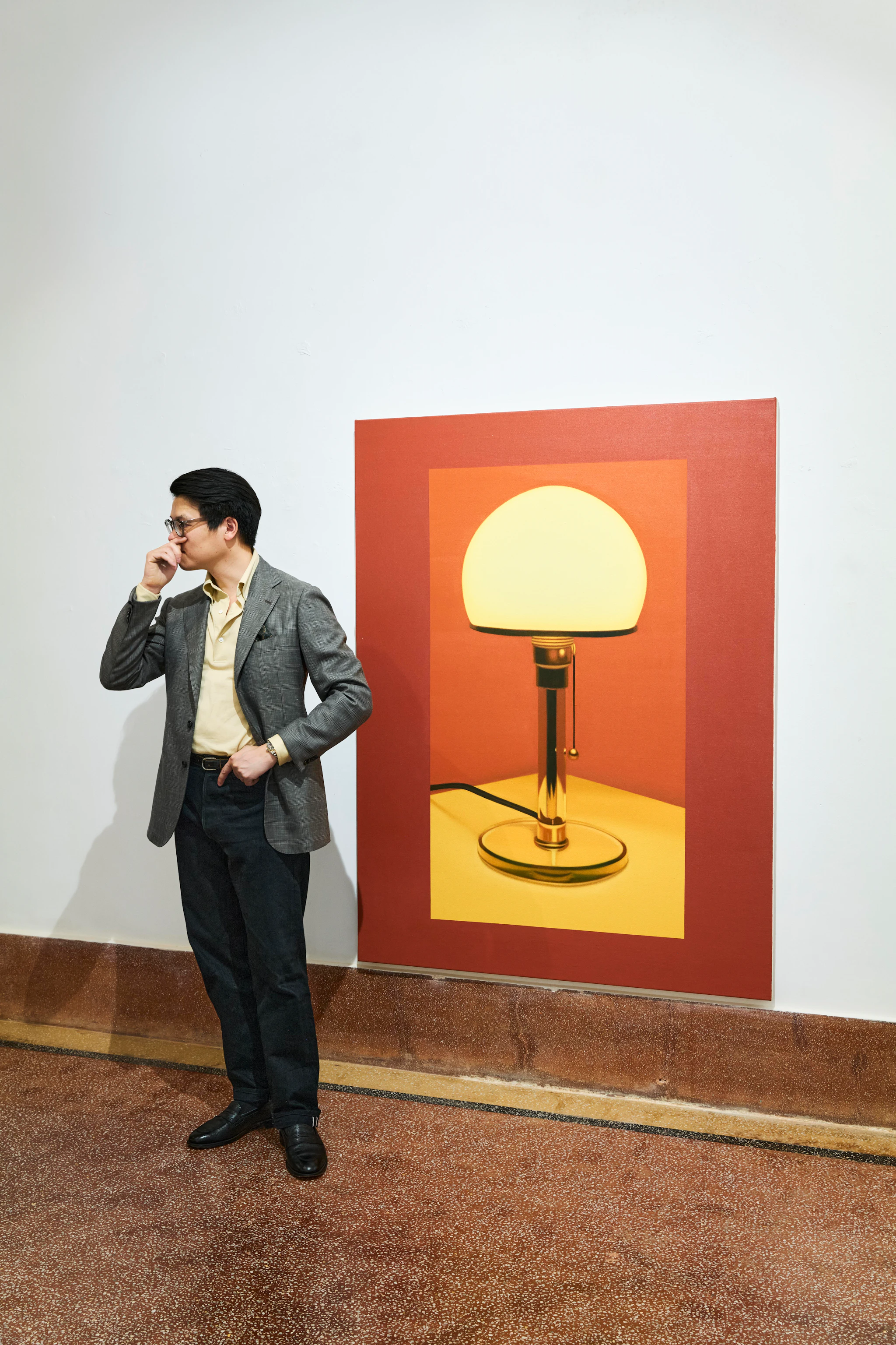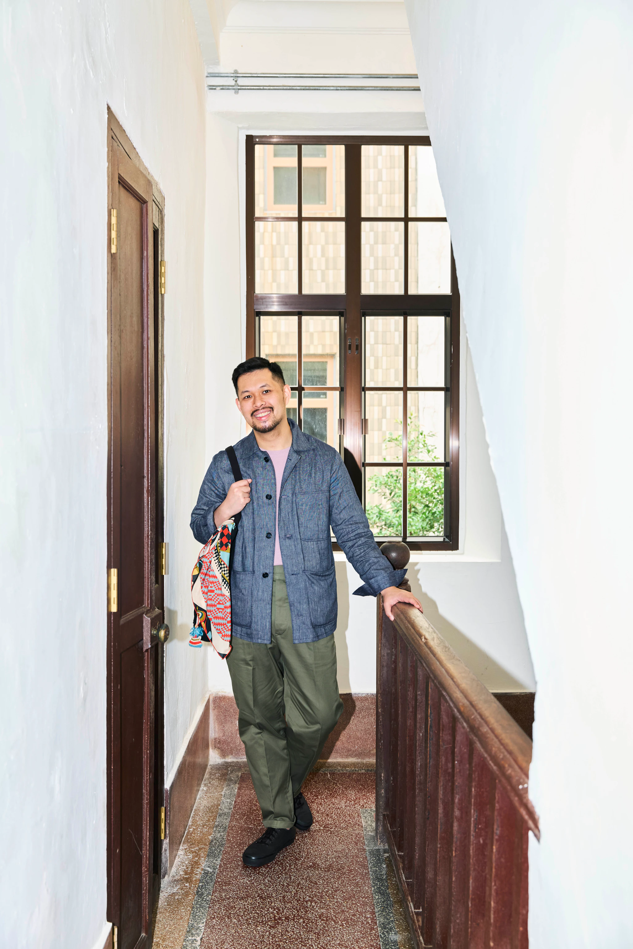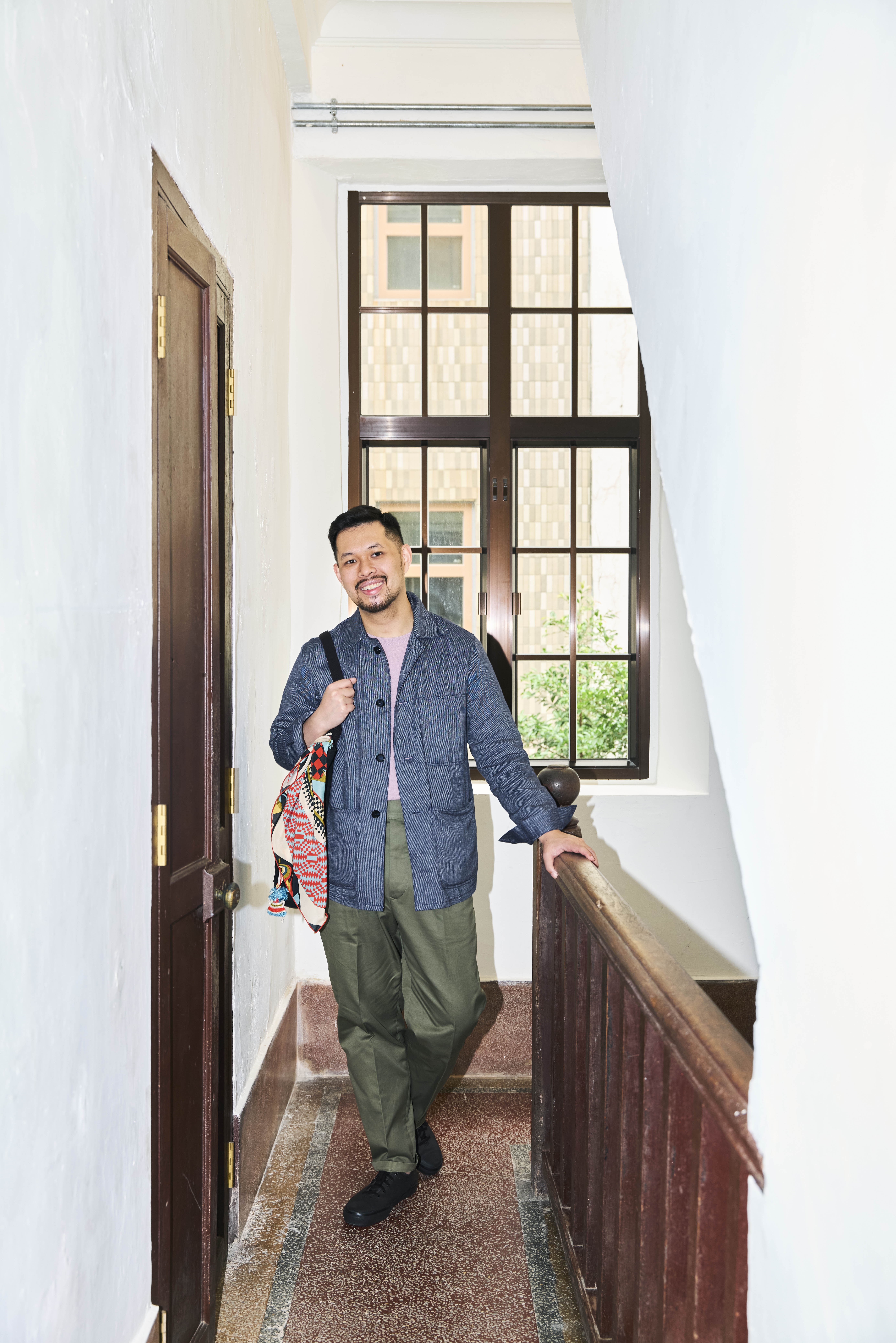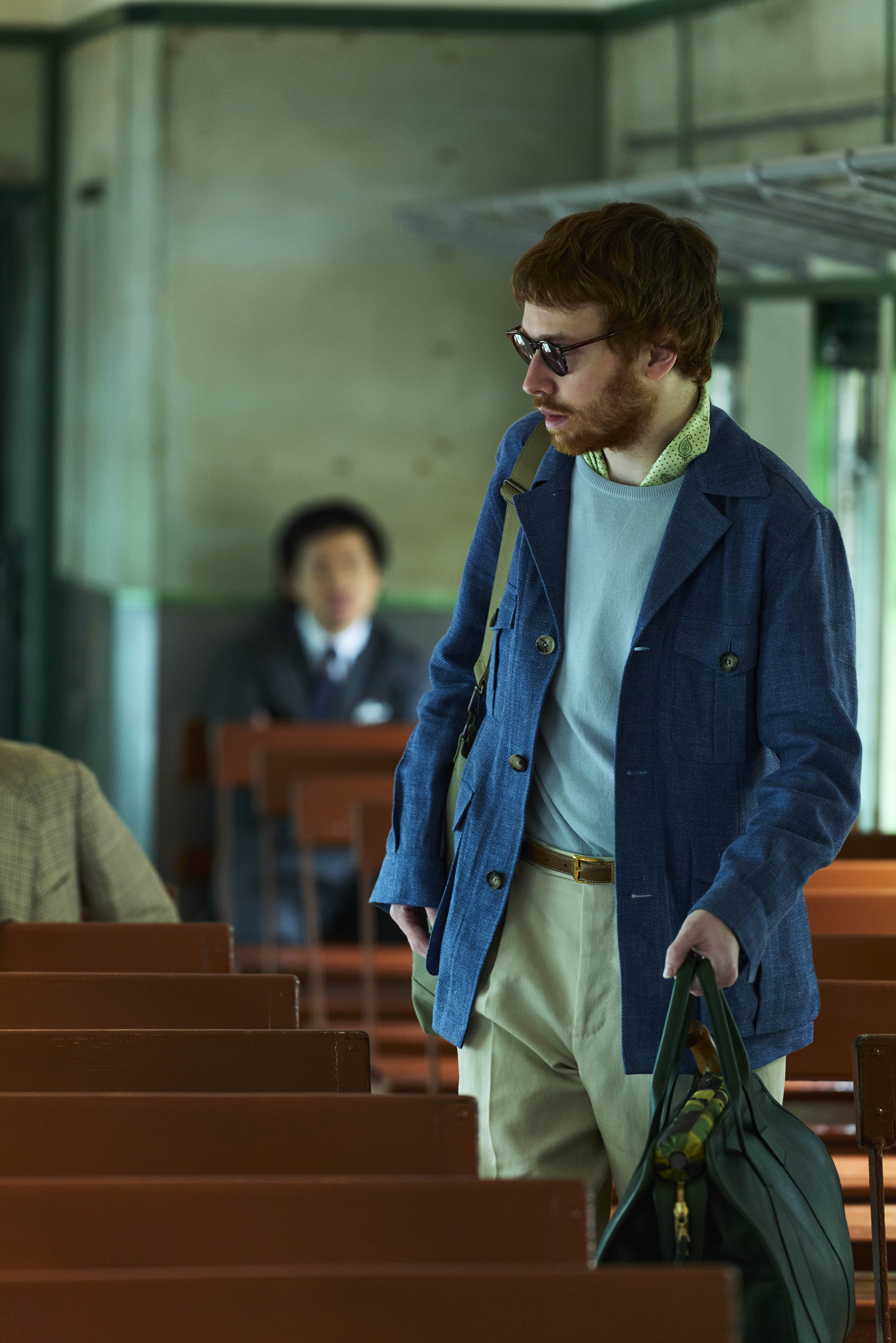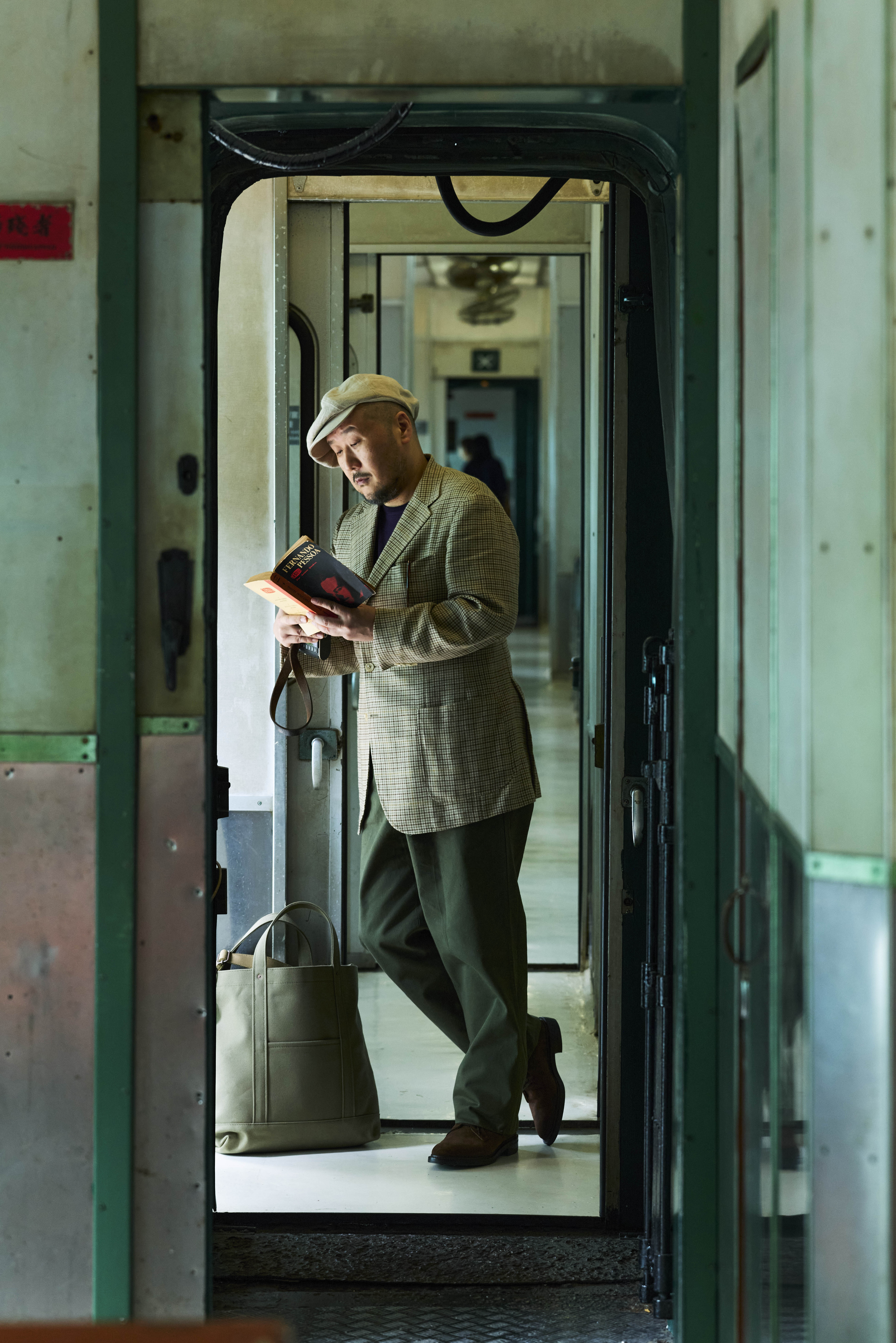 Yamashita-San wears our Model 3 Sport Coat, Ice Cotton Tee, Suede Spenser Derbies and carries a David Tote.