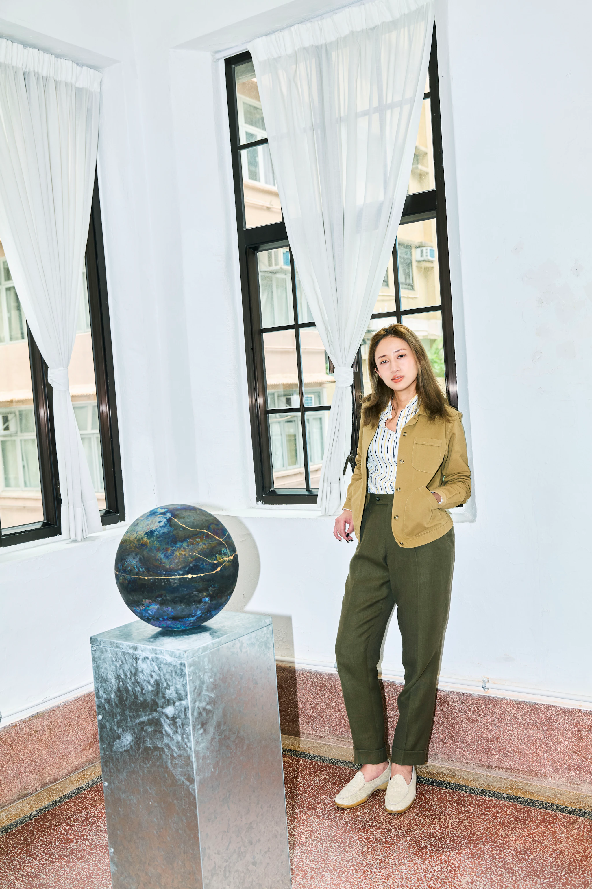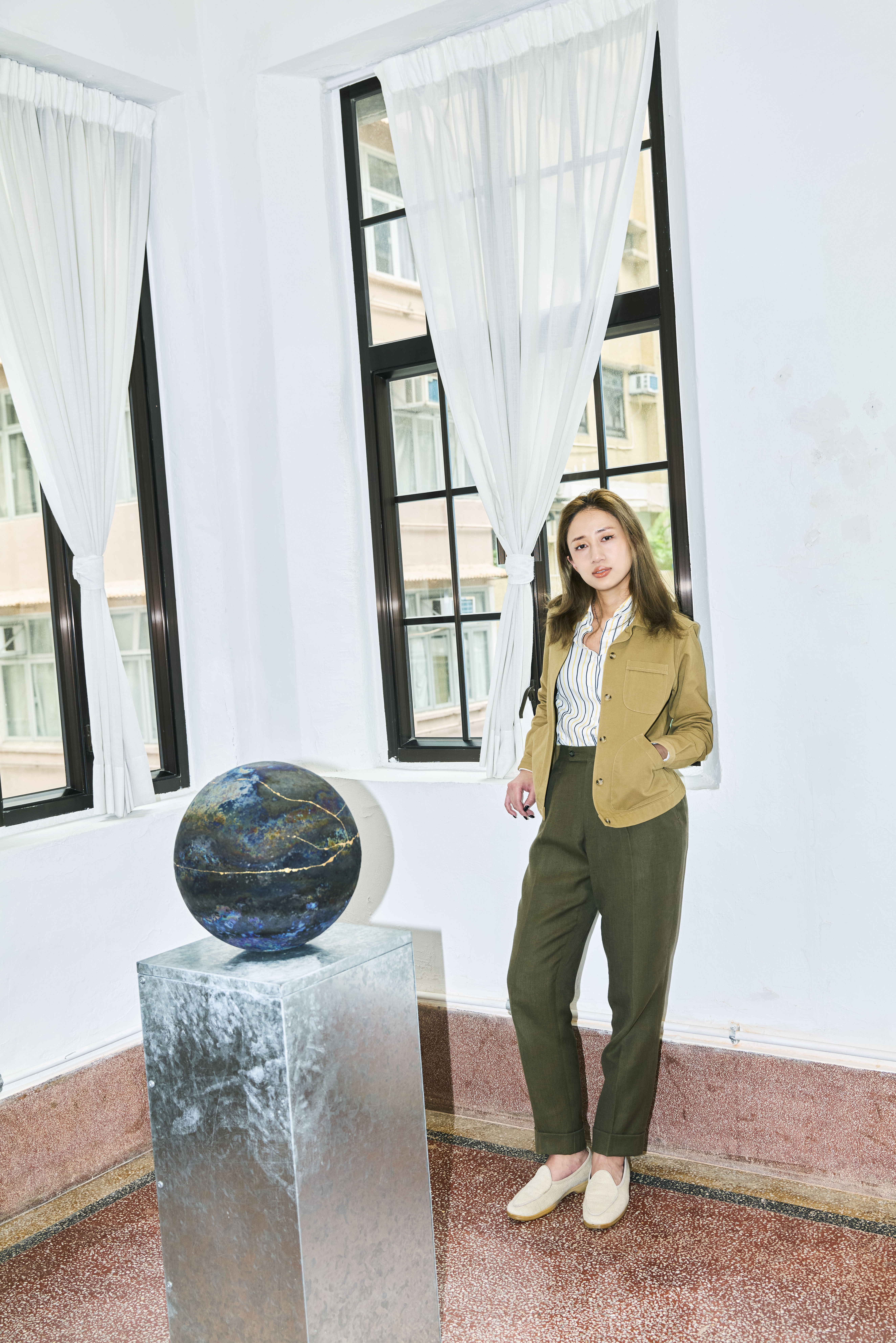 Starry wears our Campus Cardigan and Striped Ice Cotton Tee.