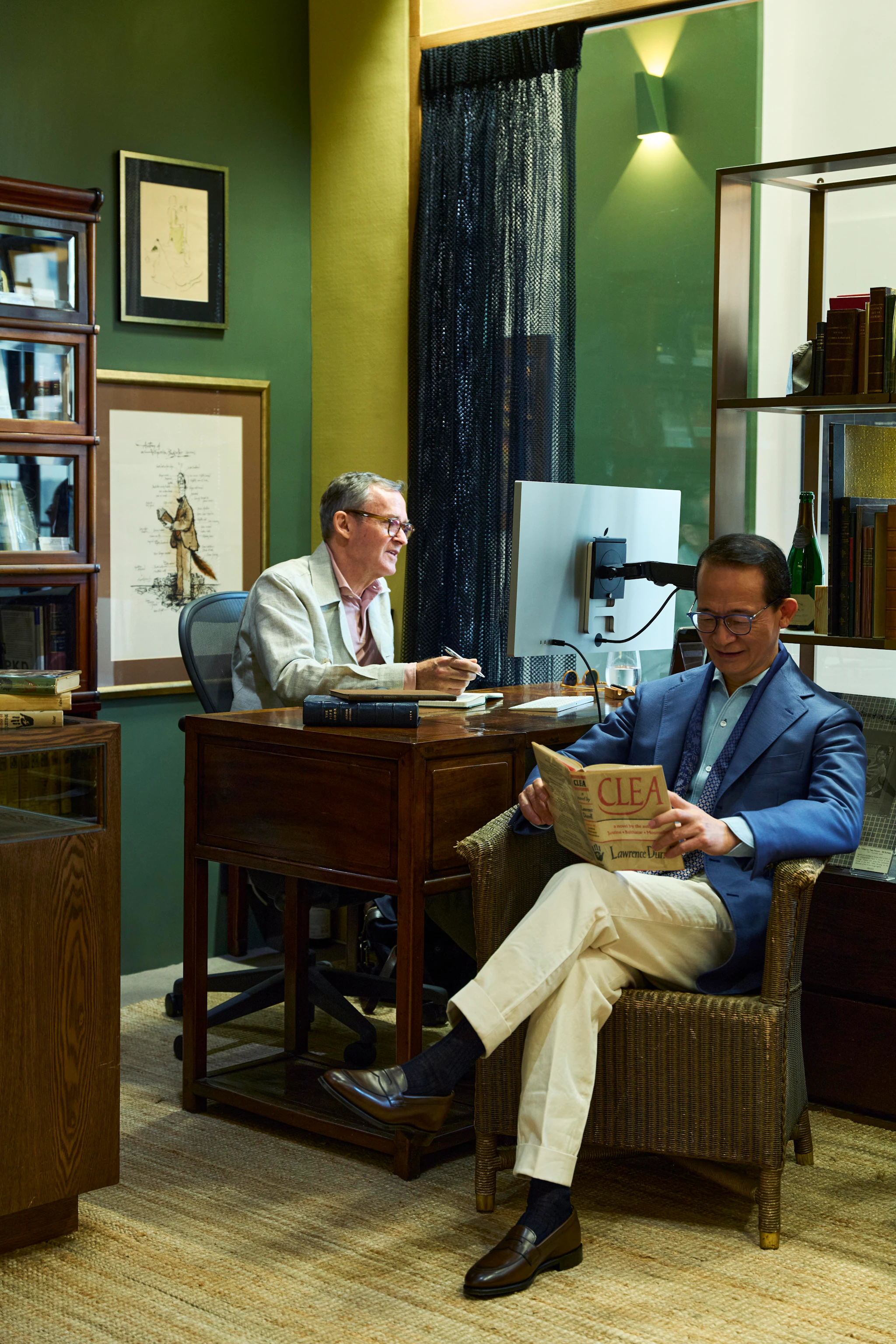 S.K. joins Lorence to peruse books in our Mohair Model 3, Sport Chinos and Duane II Loafers.