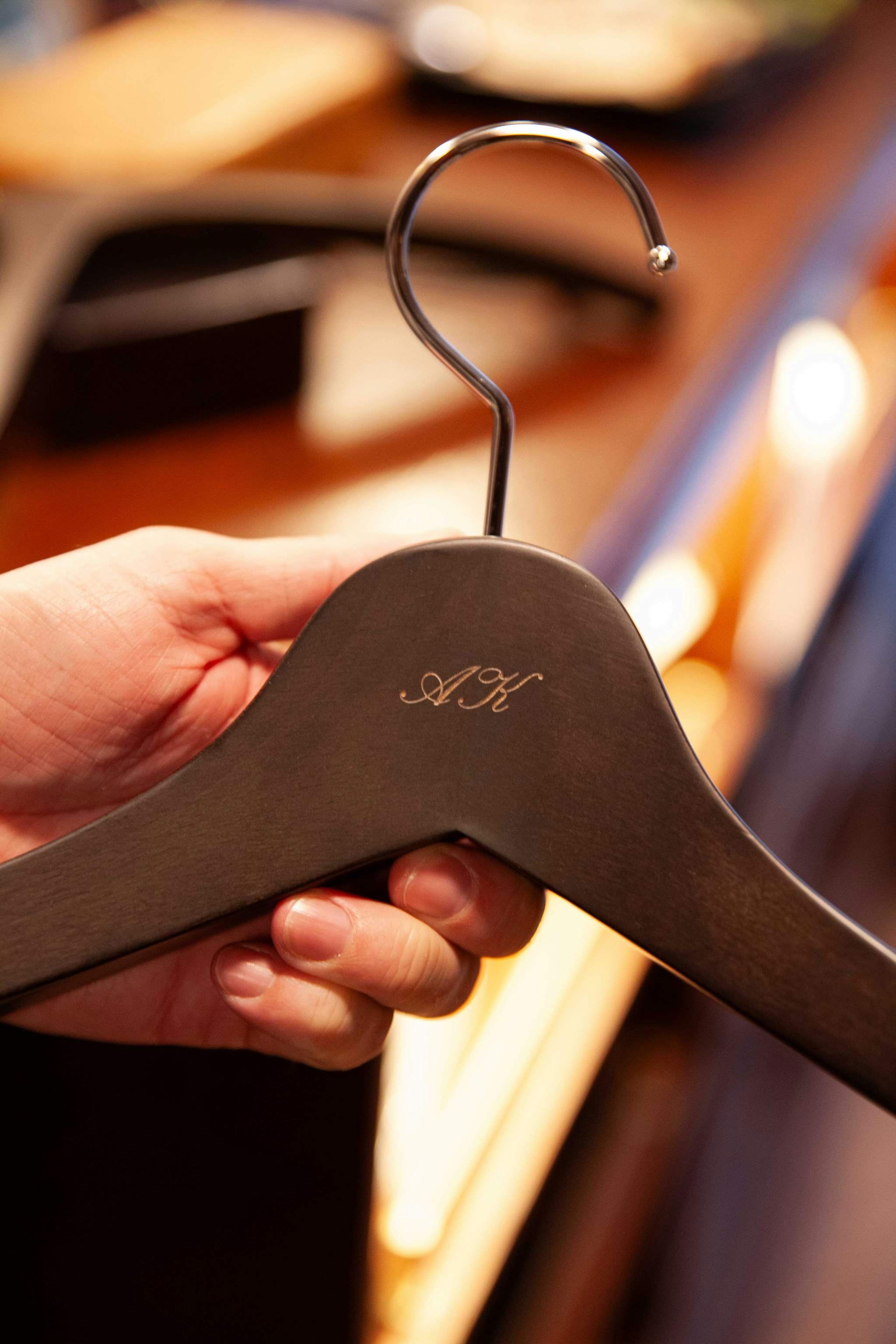 We visited our friend Mr. D to see how his latest order of hangers has sorted his previously scattered closet. Customization of materials, monograms and finishes are an opportunity to make your closet feel unique to you.