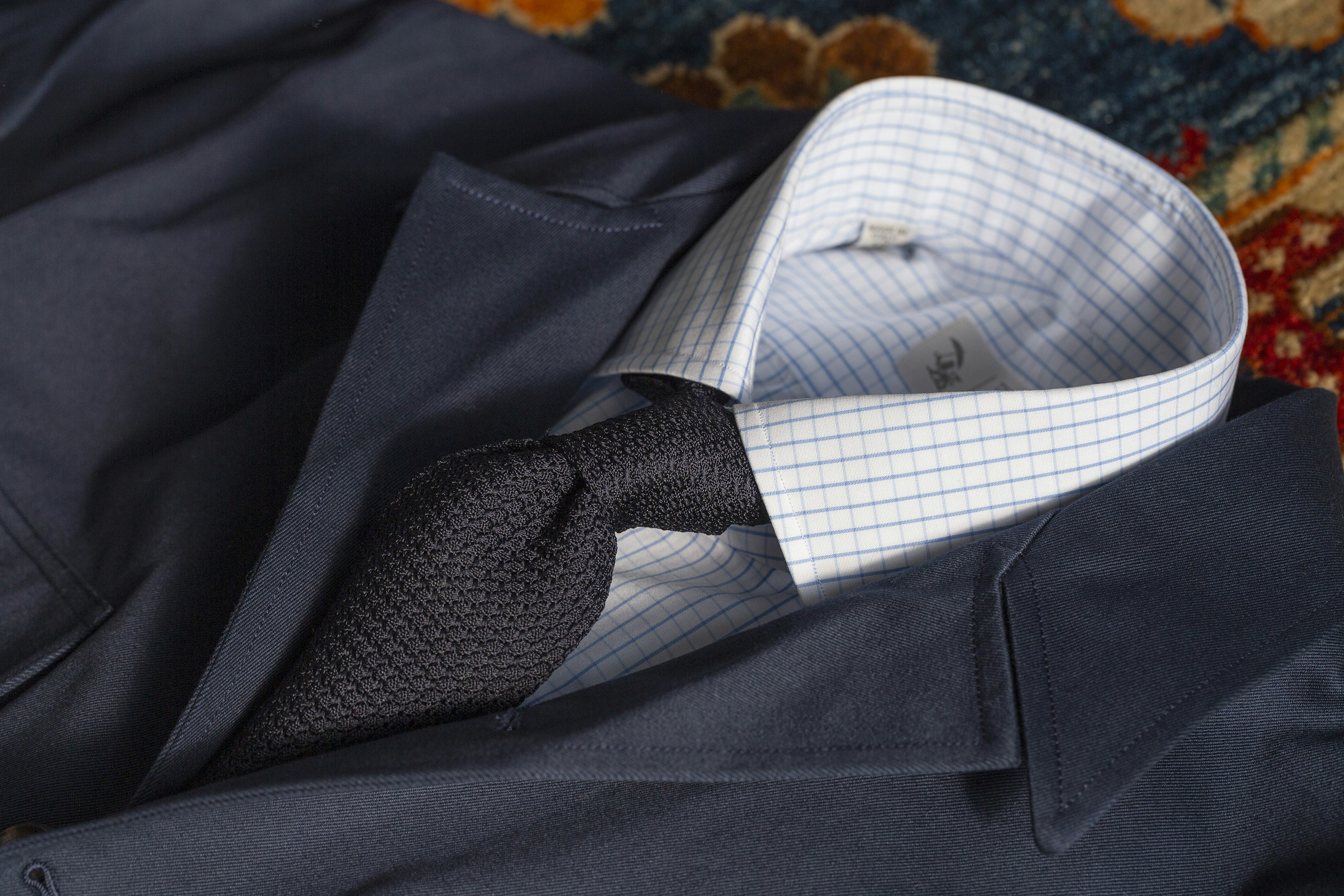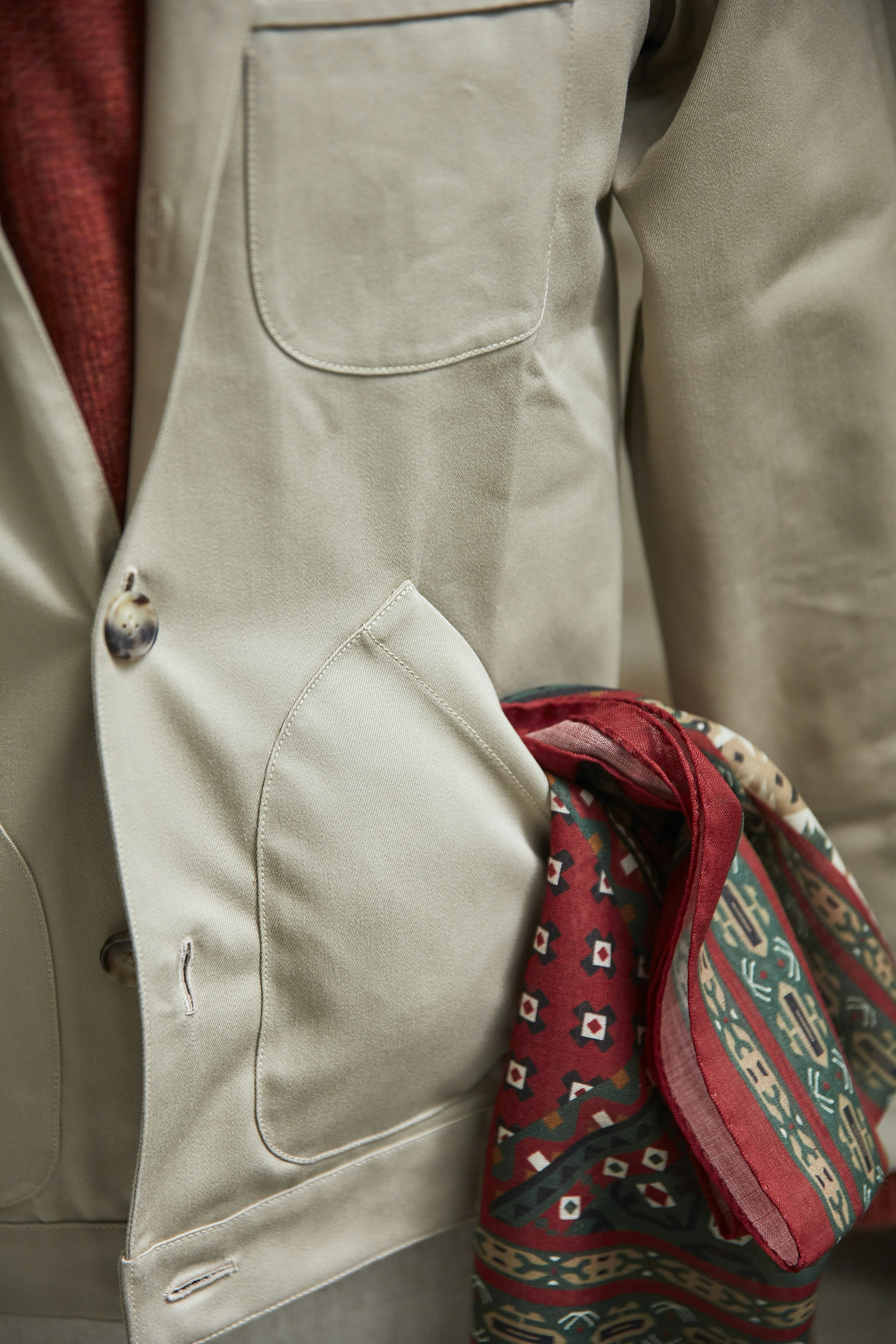 Our 3PB is a smarter take on a trucker jacket. We made it in a beige cotton that is reminiscent of WWI fatigues. Since no wardrobe is complete without beige cotton trousers, the matching chinos are a versatile companion.