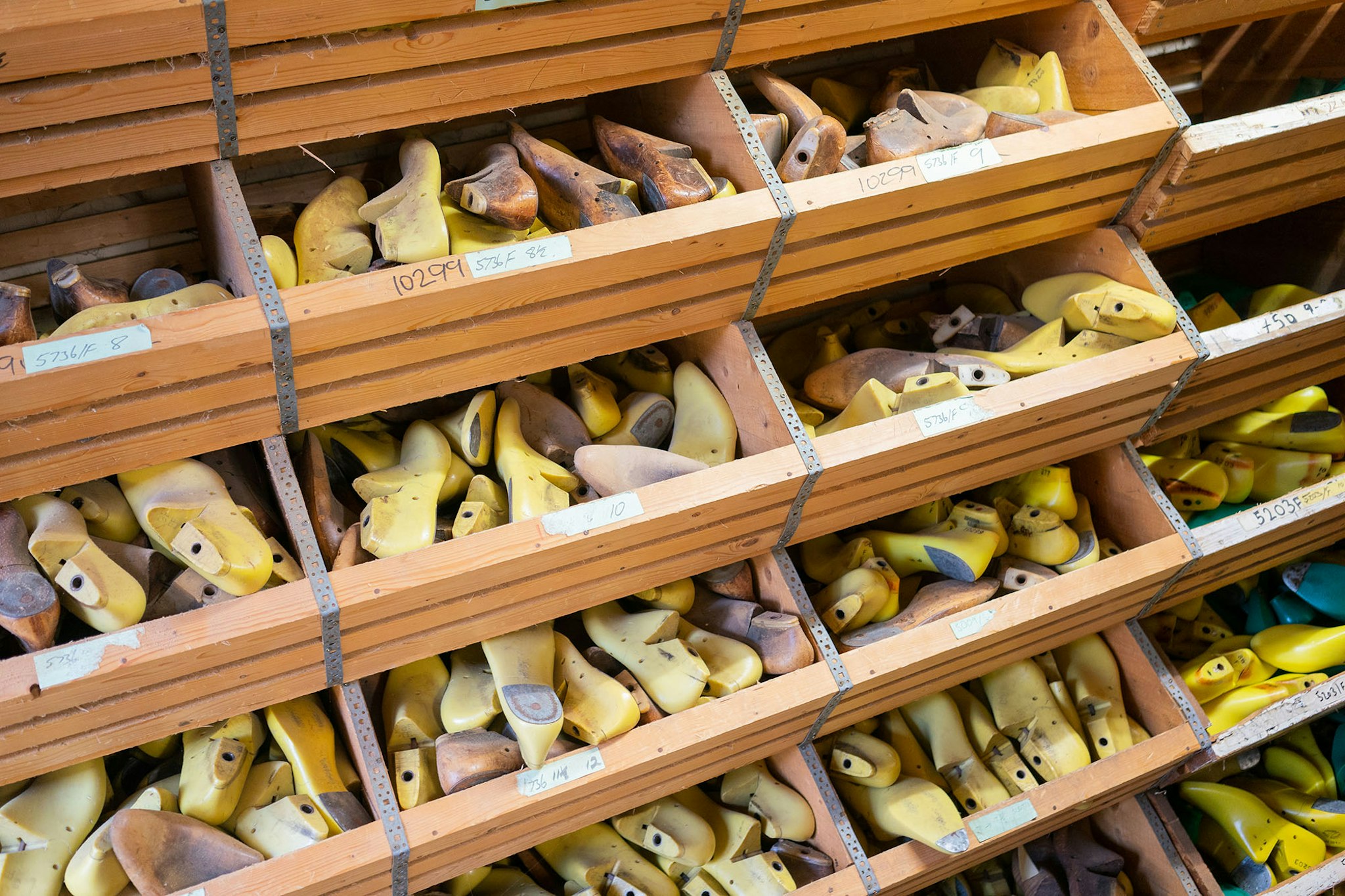 Fukuda-san carved the wooden forms as if he were making bespoke lasts, slowly refining them into prototypes. Once the shape is finalized, the lasts are size graded and duplicated in fibreglass for factory production.