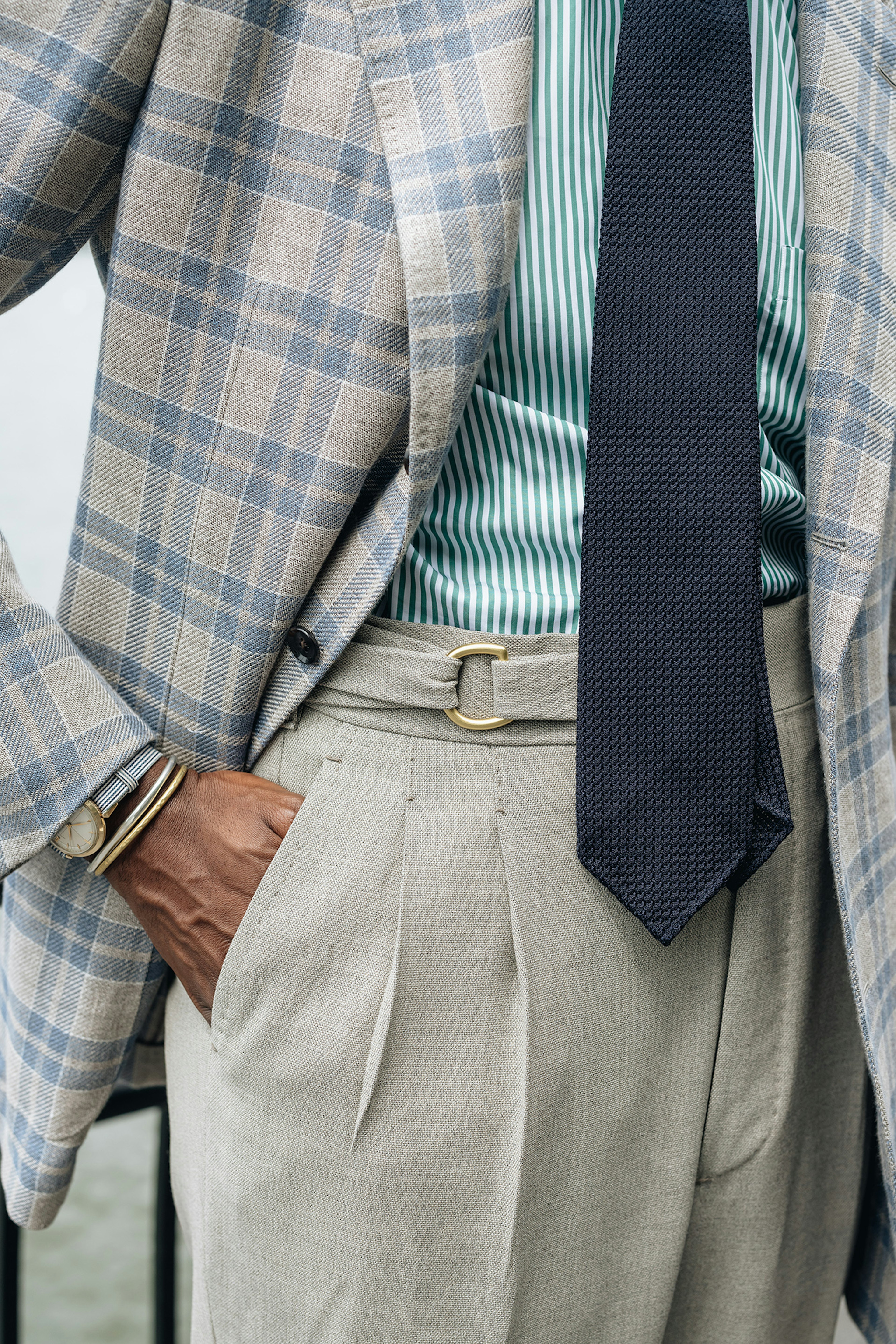 Stephon is wearing this season's Model 3 jacket paired with our cotton bengal stripe shirt and bespoke trousers from Pommella Napoli in VBC Six Ply Wool.