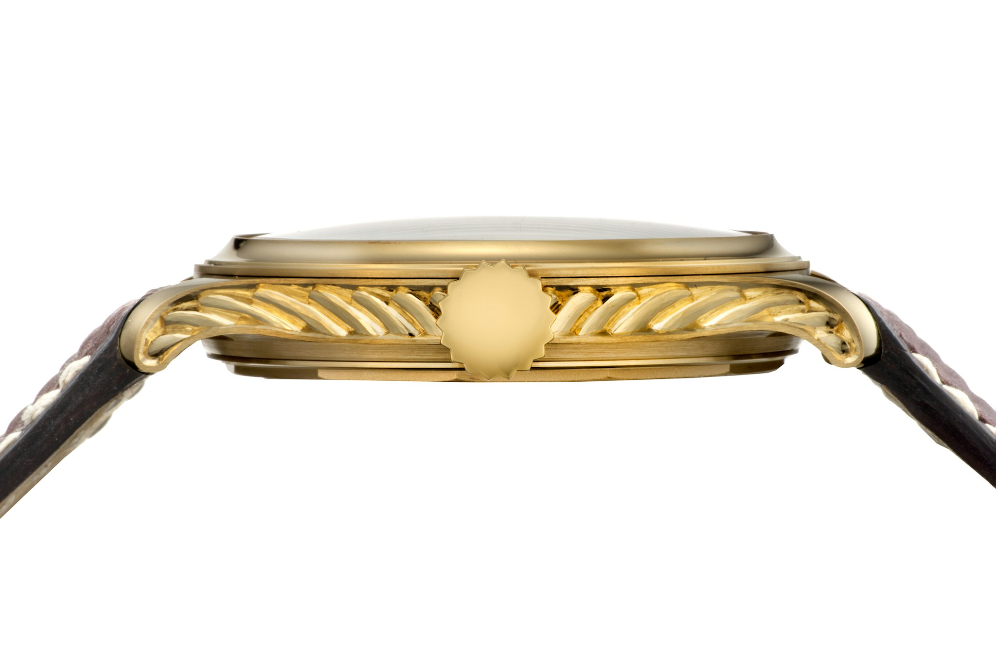 NAOYA HIDA & Co.’s first 18KYG case with hand-engraved decoration by metal engraver Keisuke Kano. The Art Deco period fountain and wave-inspired design is engraved using a simple yet powerful sculptural technique. From 2024 the newly introduced silver friction-plated German silver dial assembled a total of 60pcs 18KYG minute markers. The back of the pin buckle, also made of 18KYG, is hand-engraved with a small NH logo.