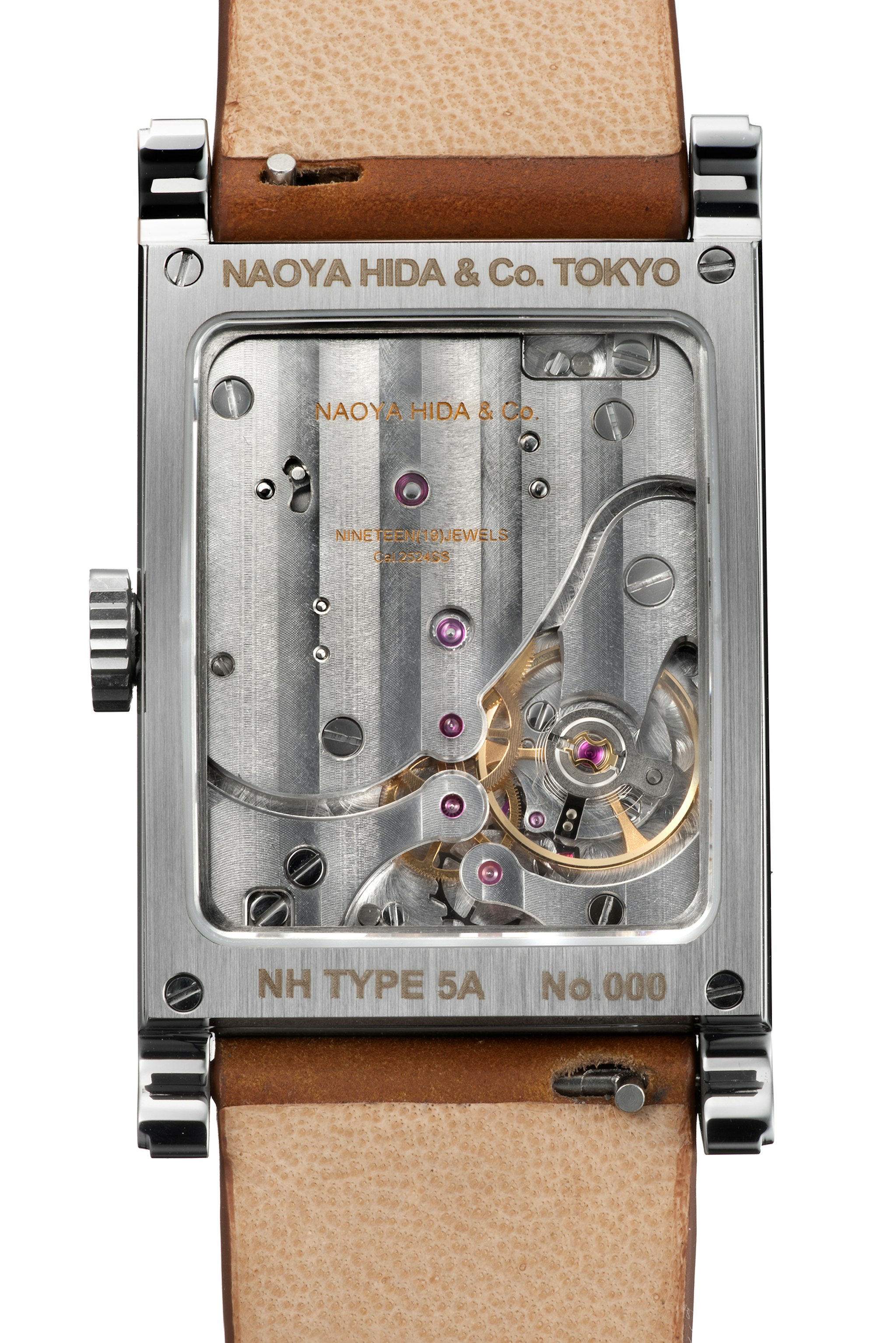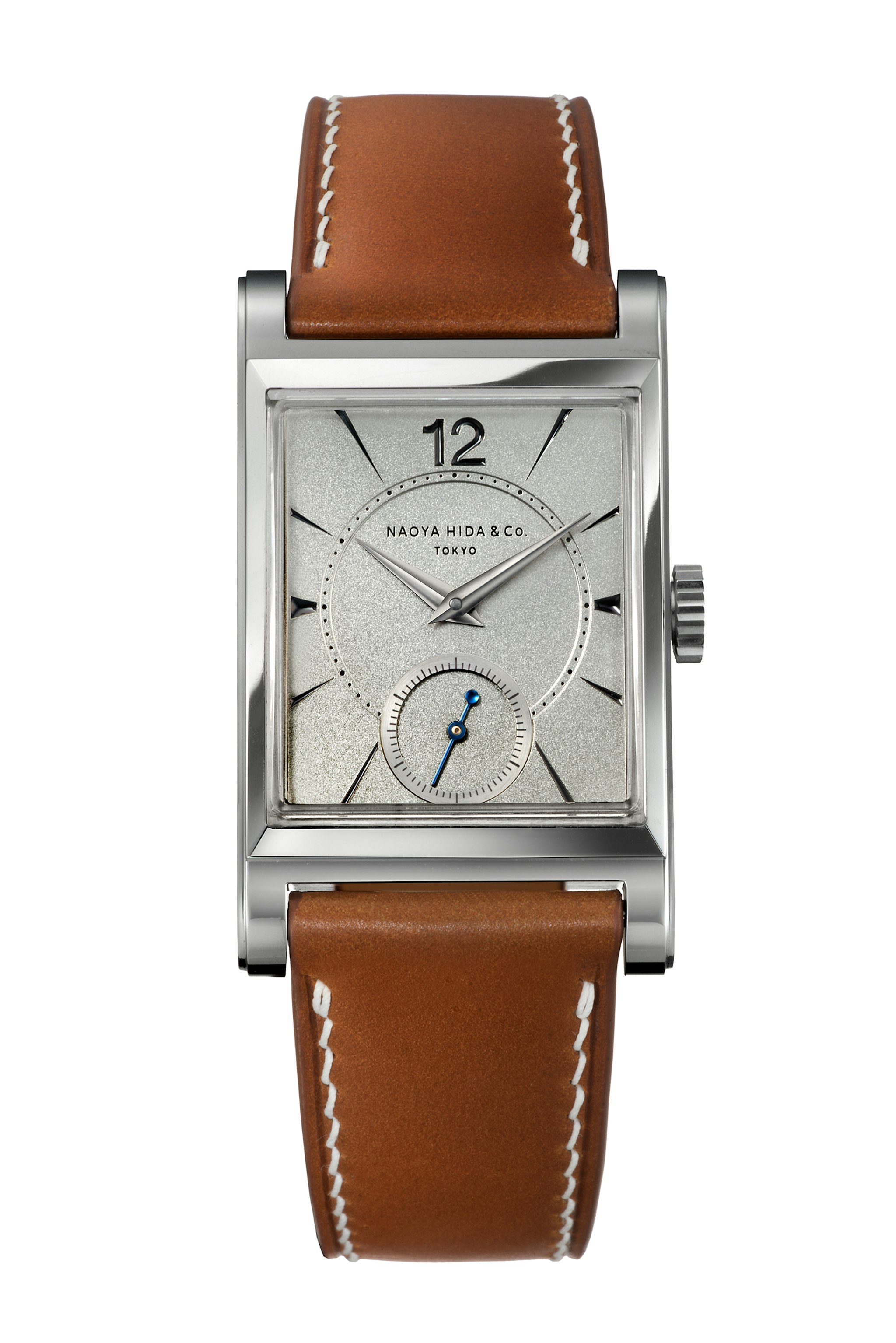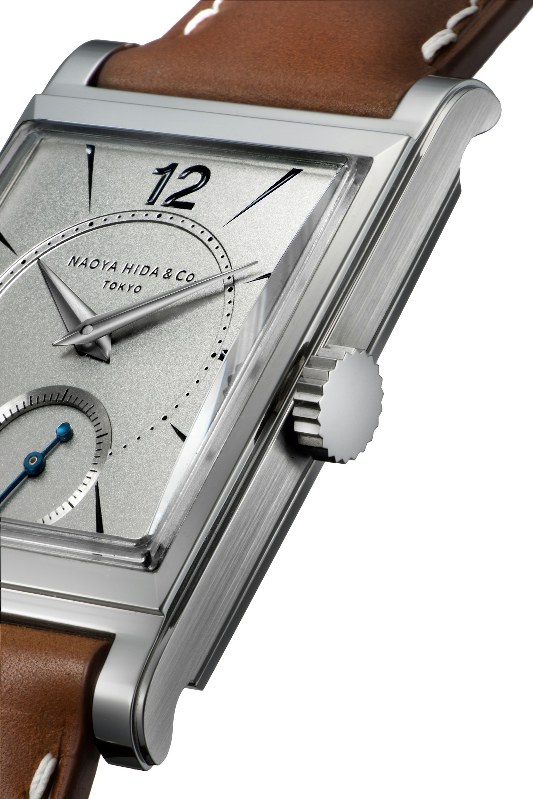 NAOYA HIDA & Co.’s first dress watch with a rectangular case. The small size of the case houses the newly developed angular movement Ca.2524SS, packed with details such as a three-dimensional sapphire crystal made up of two parts, concave dolphin hands and hand-engraved indexes.