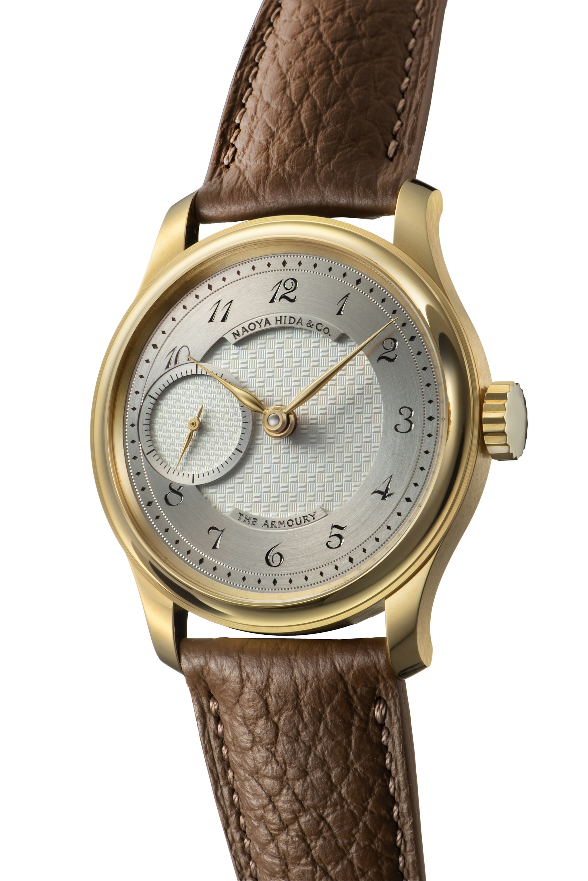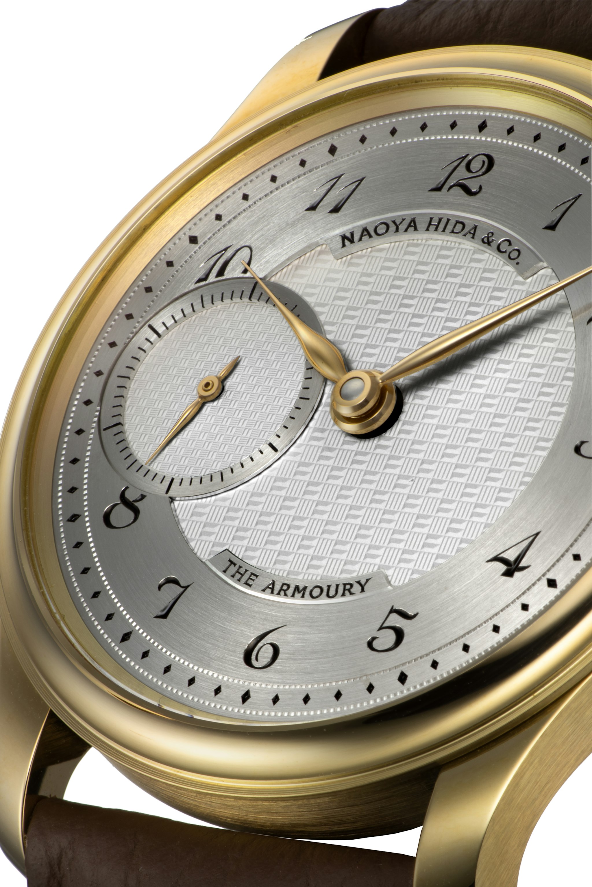 This watch is a collaboration between Naoya Hida & Co., The Armoury and J.N. Shapiro, showcasing the art of American guilloché dial-making at the highest level. Based on a classically inspired design, the solid yellow gold watch features a sterling silver dial with a hand-cut guilloché pattern by J.N. Shapiro, along with hand-engraved logos and Breguet-style Arabic numerals for a refined, artisanal finish.
