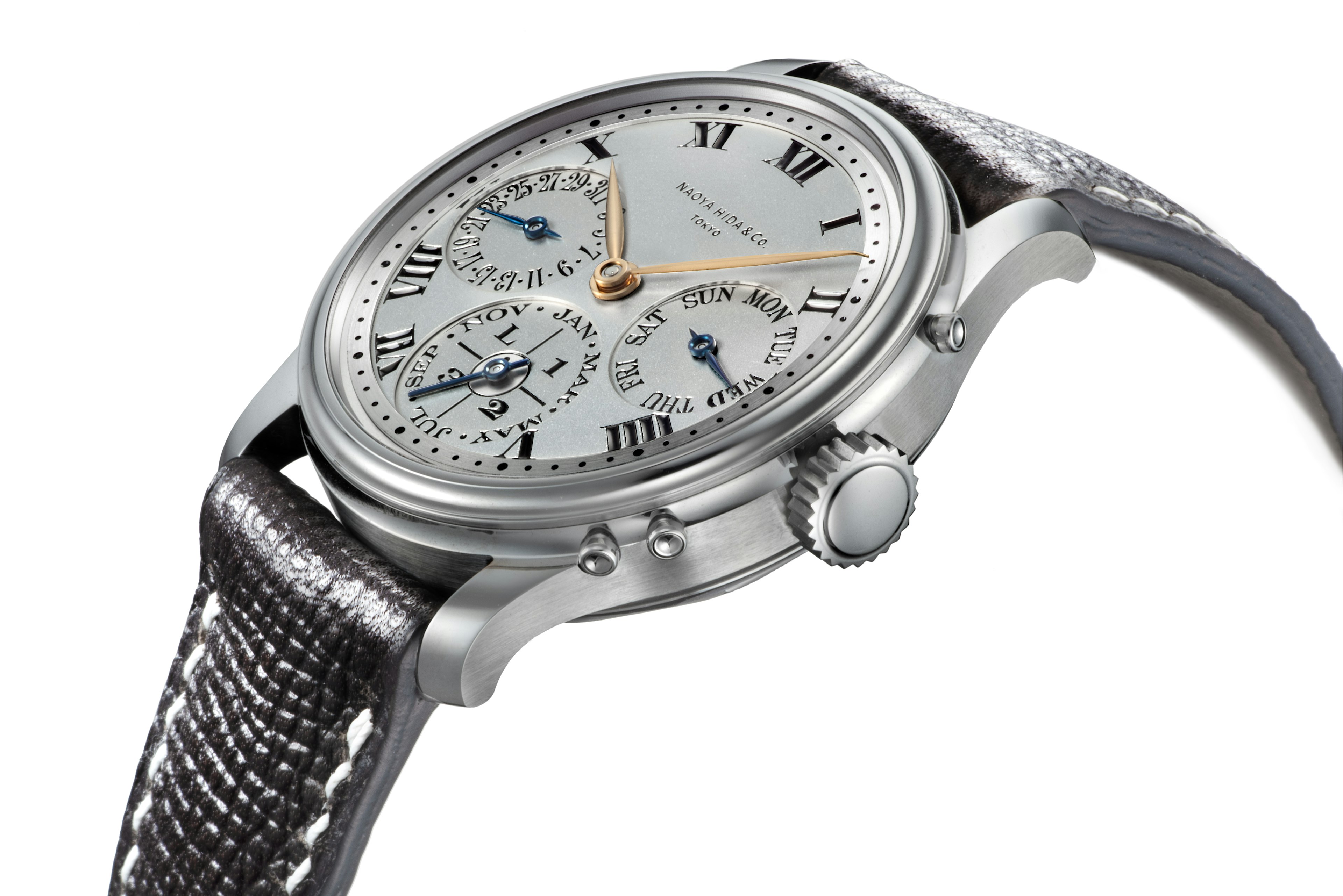 NH TYPE 6A is Naoya Hida & Co.'s dress watch equipped with a perpetual calendar. The roman numerals on the dial, as well as the sub-dials indicating the day, date, month and leap year, are all hand-engraved by the engraver Keisuke Kano. For the first time, sterling silver is used as the dial.
