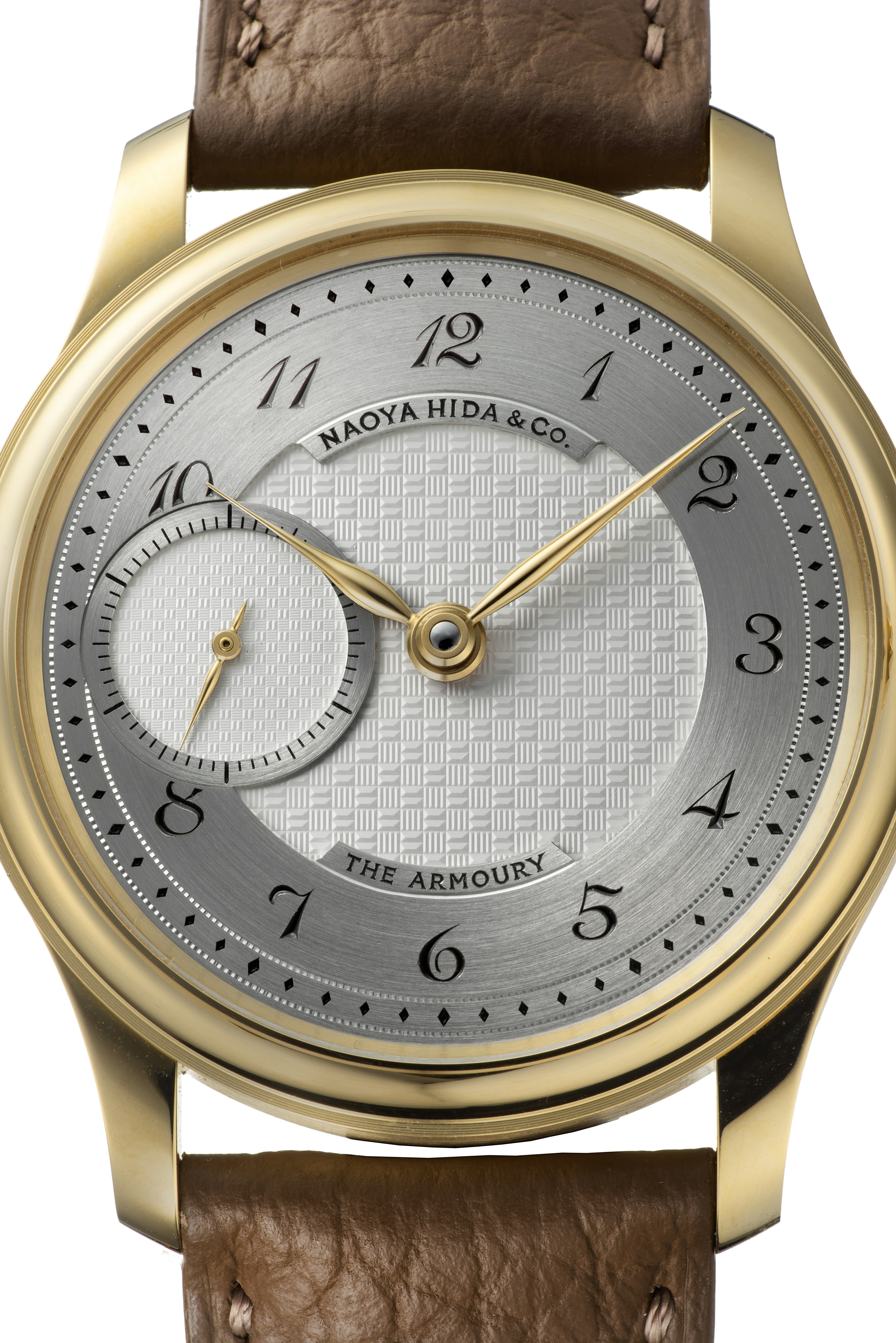 This watch is a collaboration between Naoya Hida & Co., The Armoury and J.N. Shapiro, showcasing the art of American guilloché dial-making at the highest level. Based on a classically inspired design, the solid yellow gold watch features a sterling silver dial with a hand-cut guilloché pattern by J.N. Shapiro, along with hand-engraved logos and Breguet-style Arabic numerals for a refined, artisanal finish.